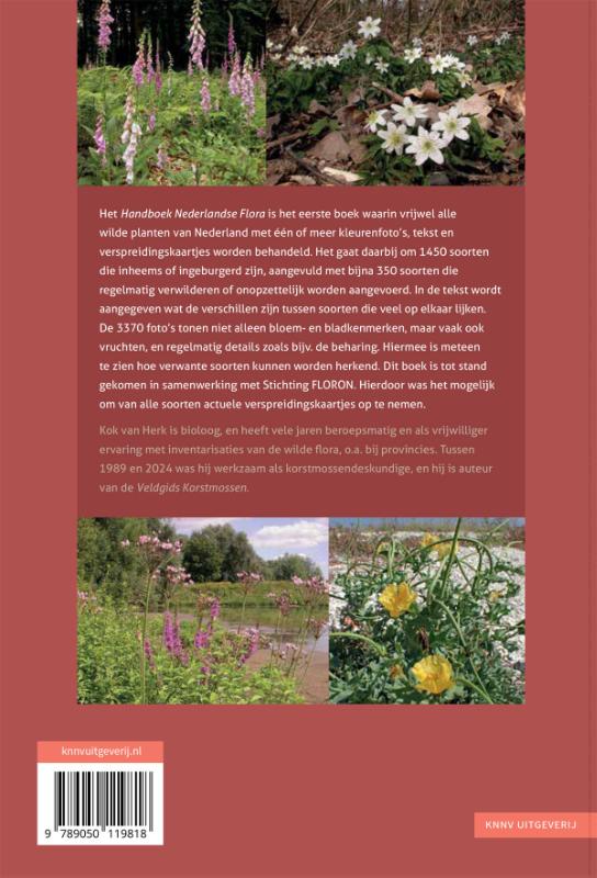 Het 'Handboek Nederlandse Flora' is het eerste boek waarin vrijwel alle wilde planten van Nederland met één of meer kleurenfoto's, tekst en verspreidingskaartjes worden behandeld. Het gaat daarbij om 1450 soorten die inheems of ingeburgerd zijn, aangevuld met bijna 350 soorten die regelmatig verwilderen of onopzettelijk worden aangevoerd. In de tekst wordt aangegeven wat de verschillen zijn tussen soorten die veel op elkaar lijken. De 3370 foto's tonen niet alleen bloem- en bladkenmerken, maar vaak ook vruchten, en regelmatig details zoals bijv. de beharing. Hiermee is meteen te zien hoe verwante soorten kunnen worden herkend. Dit boek is tot stand gekomen in samenwerking met Stichting FLORON. Hierdoor was het mogelijk om van alle soorten actuele verspreidingskaartjes op te nemen. Een perfecte aanvulling op de 'Veldgids Nederlandse flora'. Kok van Herk is bioloog, en heeft vele jaren beroepsmatig en als vrijwilliger ervaring met inventarisaties van de wilde flora, o.a. bij Provincies. Tussen 1989 en 2024 was hij werkzaam als korstmossendeskundige, en hij is auteur van de Veldgids Korstmossen.