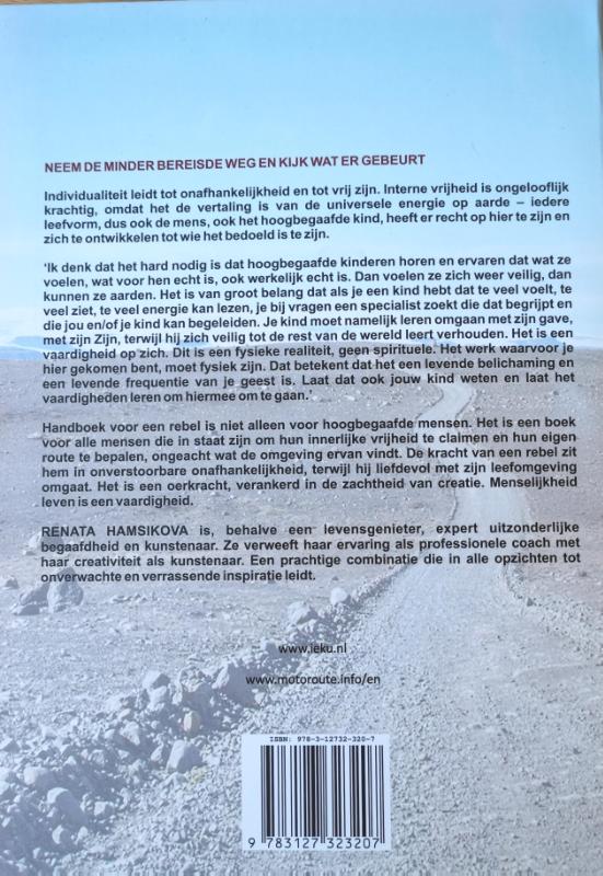 NEEM DE MINDER BEREISDE WEG EN KIJK WAT ER GEBEURT. Individualiteit leidt tot onafhankelijkheid en tot vrij zijn. Interne vrijheid is ongelooflijk krachtig, omdat het de vertaling is van de universele energie op aarde – iedere leefvorm, dus ook de mens, ook het hoogbegaafde kind, heeft er recht op hier te zijn en zich te ontwikkelen tot wie het bedoeld is te zijn. ‘Ik denk dat het hard nodig is dat hoogbegaafde kinderen horen en ervaren dat wat ze voelen, wat voor hen echt is, ook werkelijk echt is. Dan voelen ze zich weer veilig, dan kunnen ze aarden. Het is van groot belang dat als je een kind hebt dat te veel voelt, te veel ziet, te veel energie kan lezen, je bij vragen een specialist zoekt die dat begrijpt en die jou en/of je kind kan begeleiden. Je kind moet namelijk leren omgaan met zijn gave, met zijn Zijn, terwijl hij zich tot de rest van de wereld veilig leert verhouden. Het is een vaardigheid op zich. Dit is een fysieke realiteit, geen spirituele. Het werk waarvoor je hier gekomen bent, moet fysiek zijn. Dat betekent dat het een levende belichaming en een levende frequentie van je geest is. Laat dat ook jouw kind weten en laat het vaardigheden leren om hiermee om te gaan.’ Handboek voor een rebel is een boek niet alleen voor hoogbegaafde mensen. Het is een boek voor alle mensen die ertoe in staat zijn hun innerlijke vrijheid te claimen en hun eigen route te bepalen, ongeacht wat de omgeving ervan vindt. De kracht van een rebel zit hem in onverstoorbare onafhankelijkheid, terwijl hij liefdevol met zijn leefomgeving omgaat. Het is een oerkracht, verankerd in de zachtheid van creatie. De menselijkheid leven is een vaardigheid. RENATA HAMSIKOVA is behalve een levensgenieter, expert uitzonderlijke begaafdheid en kunstenaar. Ze verweeft haar ervaring als professionele coach met haar creativiteit als kunstenaar. Een prachtige combinatie die in alle opzichten tot onverwachte en verrassende inspiratie leidt.