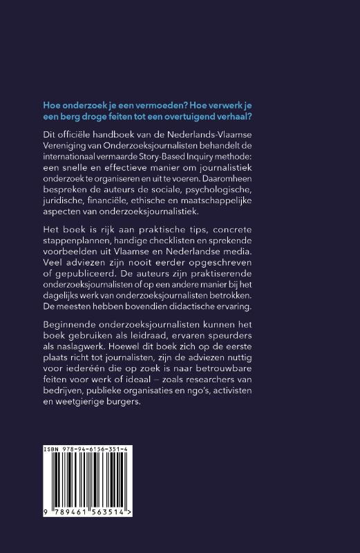 Hoe onderzoek je een vermoeden? Hoe verwerk je een berg droge feiten tot een overtuigend verhaal? Dit officiële handboek van de Nederlands-Vlaamse Vereniging van Onderzoeksjournalisten behandelt de internationaal vermaarde Story-Based Inquiry methode: een snelle en effectieve manier om journalistiek onderzoek te organiseren en uit te voeren. Daaromheen bespreken de auteurs de sociale, psychologische, juridische, financiële, ethische en maatschappelijke aspecten van onderzoeksjournalistiek. Het boek is rijk aan praktische tips, concrete stappenplannen, handige checklisten en sprekende voorbeelden uit Vlaamse en Nederlandse media. Veel adviezen zijn nooit eerder opgeschreven of gepubliceerd. De auteurs zijn praktiserende onderzoeksjournalisten of op een andere manier bij het dagelijks werk van onderzoeksjournalisten betrokken. De meesten hebben bovendien didactische ervaring. Beginnende onderzoeksjournalisten kunnen het boek gebruiken als leidraad, ervaren speurders als naslagwerk. Hoewel dit boek zich op de eerste plaats richt tot journalisten, zijn de adviezen nuttig voor iederéén die op zoek is naar betrouwbare feiten voor werk of ideaal — zoals researchers van bedrijven, publieke organisaties en ngo’s, activisten en weetgierige burgers.