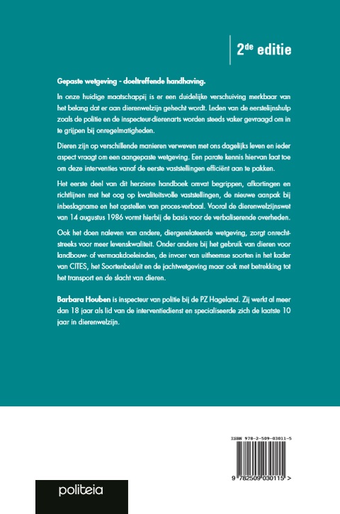 In onze huidige maatschappij wordt er steeds meer belang gehecht aan dierenwelzijn. Leden van de eerstelijnshulp zoals de politie en de inspecteur-dierenarts worden steeds vaker gevraagd om in te grijpen bij onregelmatigheden. Dieren zijn op verschillende manieren verweven met ons dagelijks leven en ieder aspect vraagt om een aangepaste wetgeving. Een parate kennis hiervan laat toe om deze interventies vanaf de eerste vaststellingen efficiënt aan te pakken. Het eerste deel van dit herziene handboek omvat begrippen, afkortingen en richtlijnen met het oog op kwaliteitsvolle vaststellingen, de nieuwe aanpak bij inbeslagname en het opstellen van een proces-verbaal. Vooral de dierenwelzijnswet van 14 augustus 1986 vormt hierbij de basis voor de verbaliserende overheden. Ook het doen naleven van andere, diergerelateerde wetgeving, zorgt onrechtstreeks voor meer levenskwaliteit, onder andere bij het gebruik van dieren voor landbouw- of vermaakdoeleinden, de invoer van uitheemse soorten in het kader van CITES, het Soortenbesluit en de jachtwetgeving maar ook met betrekking tot het transport en het slachten van dieren.