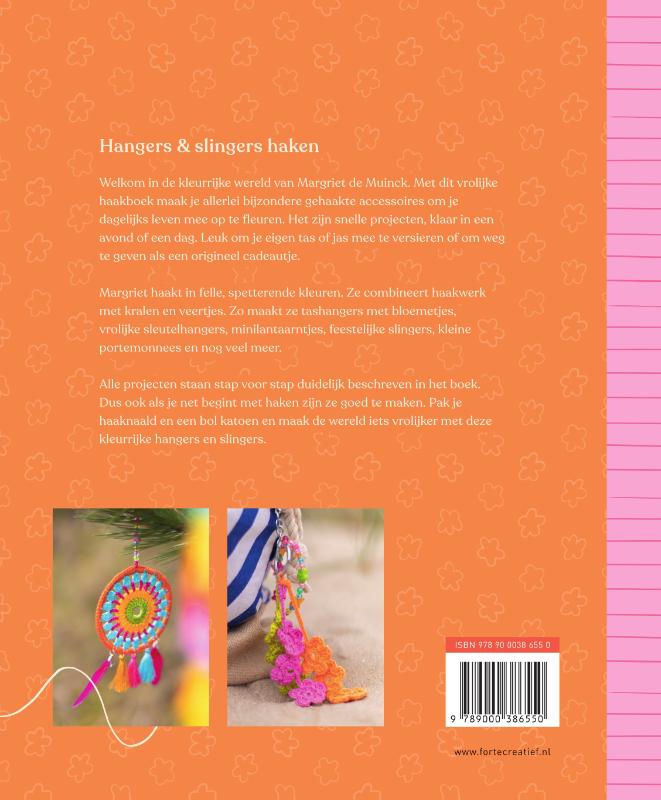 Kleurrijk gehaakte hangers voor aan je sleutels, tas of als woondecoratie Met dit vrolijke en kleurrijke haakboek maak je sleutelhangers, tassenhangers, fietsversieringen en allerlei andere gehaakte accessoires om je dagelijks leven mee op te fleuren. Het zijn snelle projecten, klaar in een avond of een dag. Leuk om je eigen tas of jas te versieren of om weg te geven als een origineel cadeautje. Margriet de Muinck haakt in felle vrolijke kleuren. Ze combineert haakwerk met kralen en veertjes. Zo maakt ze tashangers met bloemetjes, vrolijke sleutelhangers, minilantaarntjes, feestelijke slingers, kleine portemonnees en nog veel meer. Alle projecten staan stap voor stap duidelijk omschreven in het boek. Zo zijn ze ook voor beginnende hakers en haaksters goed te maken. Begin direct en maak de wereld iets vrolijker met deze kleurrijke hangers en slingers.