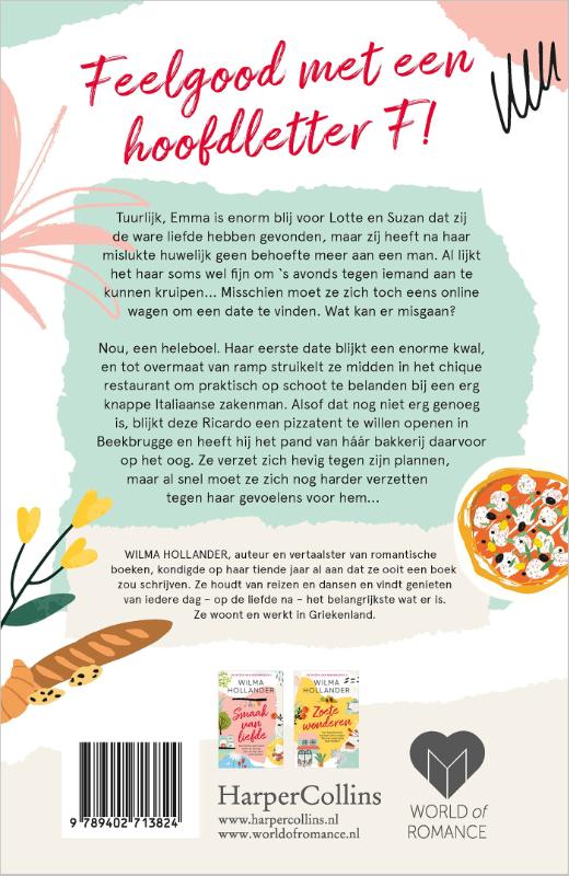 Het derde deel in de serie 'De rozen van Beekbrugge': feelgood met een hoofdletter F! Tuurlijk, Emma is enorm blij voor Lotte en Suzan dat zij de ware liefde hebben gevonden, maar zÃj heeft na haar mislukte huwelijk geen behoefte meer aan een man. Al lijkt het haar soms wel fi jn om ‘s avonds tegen iemand aan te kunnen kruipen... Misschien moet ze zich toch eens online wagen om een date te vinden. Wat kan er misgaan? Nou, een heleboel. Haar eerste date blijkt een enorme kwal, en tot overmaat van ramp struikelt ze midden in het chique restaurant om praktisch op schoot te belanden bij een erg knappe Italiaanse zakenman. Alsof dat nog niet erg genoeg is, blijkt deze Ricardo een pizzatent te willen openen in Beekbrugge en heeft hij het pand van háár bakkerij daarvoor op het oog. Ze verzet zich hevig tegen zijn plannen, maar al snel moet ze zich nog harder verzetten tegen haar gevoelens voor hem...