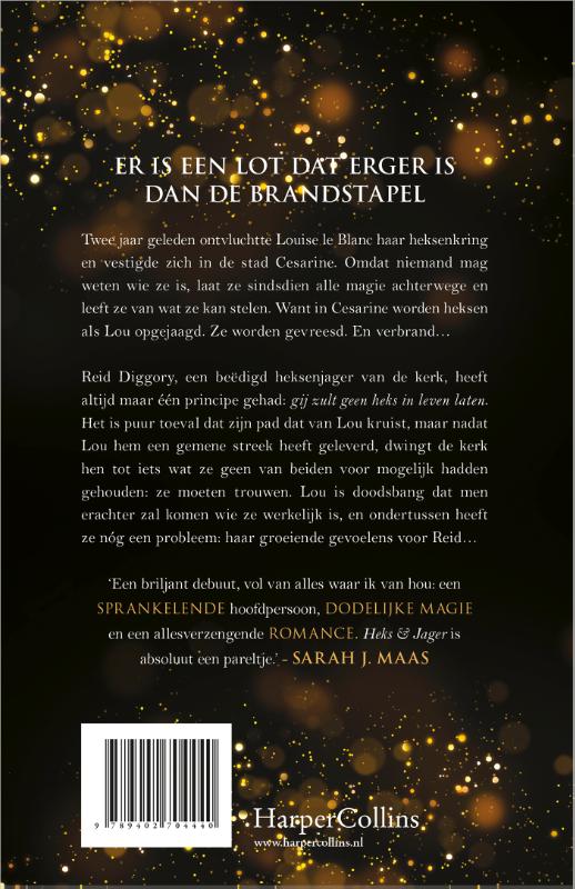 Er is een lot dat erger is dan de brandstapel Twee jaar geleden ontvluchtte Louise le Blanc haar heksenkring en vestigde zich in de stad Cesarine. Omdat niemand mag weten wie ze is, laat ze sindsdien alle magie achterwege en leeft ze van wat ze kan stelen. Want in Cesarine worden heksen als Lou opgejaagd. Ze worden gevreesd. En verbrand… Reid Diggory, een beëdigd heksenjager van de kerk, heeft altijd maar één principe gehad: gij zult geen heks in leven laten. Het is puur toeval dat zijn pad dat van Lou kruist, maar nadat Lou hem een gemene streek heeft geleverd, dwingt de kerk hen tot iets wat ze geen van beiden voor mogelijk hadden gehouden: ze moeten trouwen. Lou is doodsbang dat men erachter zal komen wie ze werkelijk is, en ondertussen heeft ze nóg een probleem: haar groeiende gevoelens voor Reid… Over Heks & Jager ' Heks & Jager zit boordevol spannende elementen waardoor het niet eens in je opkomt om het boek weg te leggen.'- ????? Chicklit