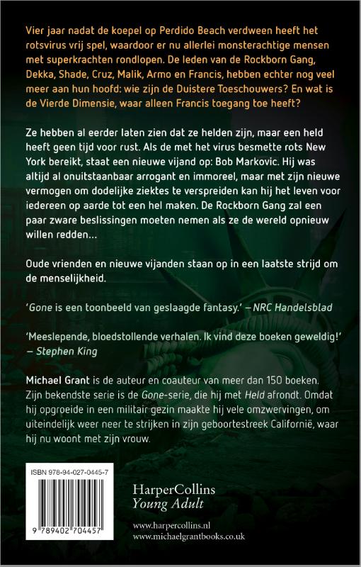 Vier jaar nadat de koepel op Perdido Beach verdween heeft het rotsvirus vrij spel, waardoor er nu allerlei monsterachtige mensen met superkrachten rondlopen. De leden van de Rockborn Gang, Dekka, Shade, Cruz, Malik, Armo en Francis, hebben echter nog veel meer aan hun hoofd: wie zijn de Duistere Toeschouwers? En wat is de Vierde Dimensie, waar alleen Francis toegang toe heeft? Ze hebben al eerder laten zien dat ze helden zijn, maar een held heeft geen tijd voor rust. Als de met het virus besmette rots New York bereikt, staat een nieuwe vijand op: Bob Markovic. Hij was altijd al onuitstaanbaar arrogant en immoreel, maar met zijn nieuwe vermogen om dodelijke ziektes te verspreiden kan hij het leven voor iedereen op aarde tot een hel maken. De Rockborn Gang zal een paar zware beslissingen moeten nemen als ze de wereld opnieuw willen redden… Oude vrienden en nieuwe vijanden staan op in een laatste strijd om de menselijkheid.