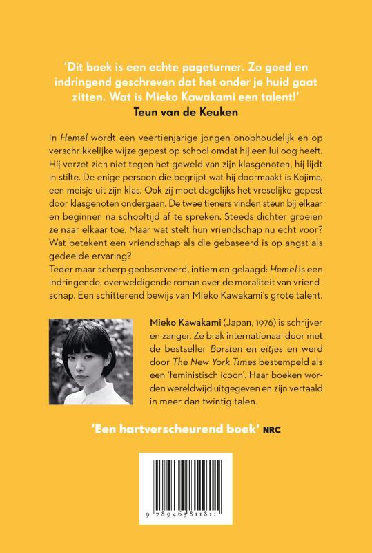 Van de bestsellerauteur van Borsten en eitjes 'Mooie filosofische roman.' de Volkskrant 'Dit boek is een echte pageturner. Zo goed en indringend geschreven dat het onder je huid gaat zitten. Wat is Mieko Kawakami een talent!' Teun van de Keuken In Hemel wordt een veertienjarige jongen onophoudelijk en op verschrikkelijke wijze gepest op school omdat hij een lui oog heeft. Hij verzet zich niet tegen het geweld van zijn klasgenoten, hij lijdt in stilte. De enige persoon die begrijpt wat hij doormaakt is Kojima, een meisje uit zijn klas. Want ook zij moet dagelijks het vreselijke gepest door klasgenoten ondergaan. De twee beginnen af te spreken na schooltijd en blijken een grote steun voor elkaar te zijn. Steeds dichter groeien ze naar elkaar toe. Maar wat stelt hun vriendschap nu echt voor? Want wat kan een vriendschap betekenen als die gebaseerd is op angst als gedeelde ervaring? Teder maar scherp geobserveerd, intiem en gelaagd: Hemel is een indringende, overweldigende roman over de moraliteit van vriendschap. Een schitterend bewijs van Mieko Kawakami's grote talent. ' Hemel van Mieko Kawakami over twee buitenbeentjes op school is adembenemend.' Trouw 'Kawakami plaatst de lezer in de huid van een slachtoffer van pesten, een gruwelijke ervaring.' Het Parool 'Kawakami predikt nooit, wijst nergens met haar vingertje. Dit is de echte magie van Hemel : laten zien hoe we over moraliteit kunnen nadenken.' The New Yorker 'Met twee buitenbeentjes als ongelukkige hoofdpersonages is dit een uitmuntend verteld, diep verontrustend verhaal over geweld onder tieners, dat de auteur ongetwijfeld nog geliefder zal maken.' Vogue ' Hemel is een indringende, overweldigende roman over de moraliteit van vriendschap.' De Standaard der Letteren 'De mix van hormonen, puberpijn, onzekerheid en ontluikende seksualiteit levert een borrelende roman op.' **** Knack Focus 'Een teder boek, een aanrader voor jongvolwassenen.' AD Mezza 'Een hartverscheurend boek over de vriendschap tussen twee veertienjarige outcasts op een middelbare school.' NRC Handelsblad