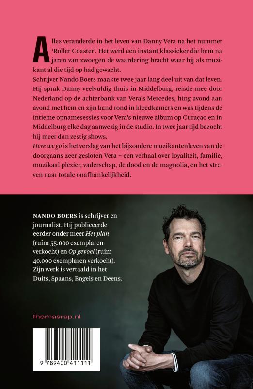 Het nummer ‘Roller Coaster’ veranderde het leven van Danny Vera. Het werd een instant klassieker en bracht hem na jaren van zwoegen de waardering die hij als muzikant najaagde. Schrijver Nando Boers bevond zich de afgelopen twee jaar in de binnenste ring van Danny Vera’s leven. Hij sprak hem veelvuldig thuis in Middelburg, reisde mee door Nederland op de achterbank van Vera’s Mercedes, hing avond aan avond met hem en zijn band rond in kleedkamers en was tijdens de intieme opnamesessies voor Vera’s nieuwe album op Curaçao en in Middelburg elke dag aanwezig in de studio. Boers bezocht de afgelopen twee jaar meer dan zestig shows. Here we go is de neerslag van het bijzondere muzikantenleven van de doorgaans zeer gesloten Vera – een verhaal over loyaliteit, familie, muzikaal plezier, vaderschap, de dood en de magnolia, en het streven naar totale onafhankelijkheid.