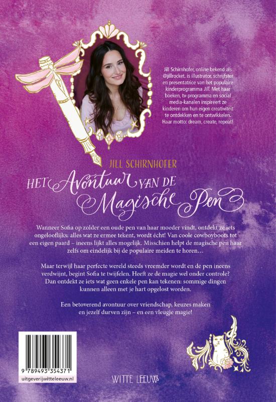 Beleef een betoverend avontuur vol verrassingen, vriendschap en een vleugje magie in Het avontuur van de magische pen van Jill. Boordevol prachtige illustraties van Jill zelf! Wanneer Sofia op zolder een oude pen van haar moeder vindt, ontdekt ze iets ongelooflijks: alles wat ze ermee tekent, wordt écht. Van hippe sneakers tot een eigen paard – ineens lijkt alles mogelijk. Misschien helpt de magische pen haar zelfs om eindelijk bij de populaire meiden te horen… Maar naarmate haar perfecte wereld steeds vreemder wordt en de pen ineens verdwijnt, begint Sofia te twijfelen: heeft ze de magie wel onder controle? En dan ontdekt ze iets wat geen enkele pen kan tekenen: dat sommige dingen alleen vanbinnen opgelost kunnen worden. Jill Schirnhofer, bekend van haar creatieve kinderprogramma Jill , waar sinds 2014 kinderen in Nederland en België mee zijn opgegroeid, heeft al meer dan twintig geïllustreerde teken- en doeboeken op haar naam staan. Ze speelde in de films en jeugdserie Misfit en heeft haar eigen lijn DIY-producten. Via haar social media kanalen deelt ze tekentips, inspiratie en haar creatieve kijk op haar omgeving. Het is haar missie haar doelgroep te stimuleren zelf aan de slag te gaan en hen daarbij ook de handvatten te geven om hun eigen authentieke stijl te vinden. Haar slogan is dan ook: dream, create, repeat!