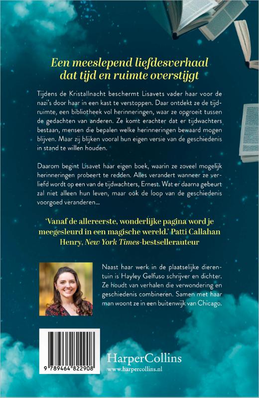Het boek van verloren uren van Hayley Gelfuso is een filmische liefdesgeschiedenis over herinneringen, tijd en de kracht van verhalen. Tijdens de Kristallnacht beschermt Lisavets vader haar voor de nazi’s door haar in een kast te verstoppen. Daar ontdekt ze de tijdruimte, een bibliotheek vol herinneringen, waar ze opgroeit tussen de gedachten van anderen. Ze komt erachter dat er tijdwachters bestaan, mensen die bepalen welke herinneringen bewaard mogen blijven. Maar zij blijken vooral hun eigen versie van de geschiedenis in stand te willen houden. Daarom begint Lisavet haar eigen boek, waarin ze zoveel mogelijk herinneringen probeert te redden. Alles verandert wanneer ze verliefd wordt op een van de tijdwachters, Ernest. Wat er daarna gebeurt zal niet alleen hun leven, maar ook de loop van de geschiedenis voorgoed veranderen… ‘Vanaf de allereerste, wonderlijke pagina word je meegesleurd in een magische wereld.’ Patti Callahan Henry, New York Times -bestsellerauteur