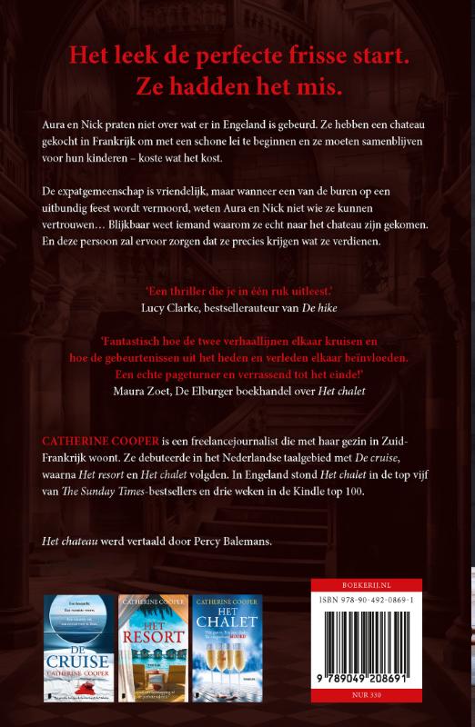 Opnieuw een geweldige locked room -thriller waarin niemand veilig is, van de Sunday Times -bestsellerauteur Catherine Cooper Een schitterend kasteel. Een stel op de rand van de afgrond. Een geheim dat hoe dan ook uitkomt. Aura en Nick praten niet over wat er in Engeland is gebeurd. Ze hebben een chateau gekocht in Frankrijk om met een schone lei te beginnen en ze moeten samenblijven voor hun kinderen – koste wat het kost. De expatgemeenschap is vriendelijk, maar wanneer een van de buren op een uitbundig feest wordt vermoord, weten Aura en Nick niet wie ze kunnen vertrouwen… Blijkbaar weet iemand waarom ze echt naar het chateau zijn gekomen. En deze persoon gaat ervoor zorgen dat ze precies krijgen wat ze verdienen. Over de boeken van Catherine Cooper ‘De sfeer wordt steeds dreigender.’ Margriet over Het chalet ‘Catherine Cooper zorgt voor een spannend verhaal dat ideaal is om te lezen op een zonnige vakantiebestemming. De lezer zal absoluut niet teleurgesteld worden in dit boek vol plottwists.’ Vrouwenthrillers.nl over De cruise ‘Agatha Christie met glamour!’ The Sunday Times
