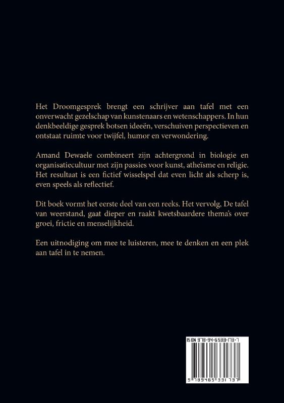 Het Droomgesprek brengt een schrijver aan tafel met een onverwacht gezelschap van kunstenaars en wetenschappers. In hun denkbeeldige gesprek botsen ideeën, verschuiven perspectieven en ontstaat ruimte voor twijfel, humor en verwondering. Amand Dewaele combineert zijn achtergrond in biologie en organisatiecultuur met zijn passies voor kunst, atheïsme en religie. Het resultaat is een fictief wisselspel dat even licht als scherp is, even speels als reflectief. Dit boek vormt het eerste deel van een reeks. Het vervolg, De tafel van weerstand, gaat dieper en raakt kwetsbaardere thema’s over groei, frictie en menselijkheid. Een uitnodiging om mee te luisteren, mee te denken en een plek aan tafel in te nemen.