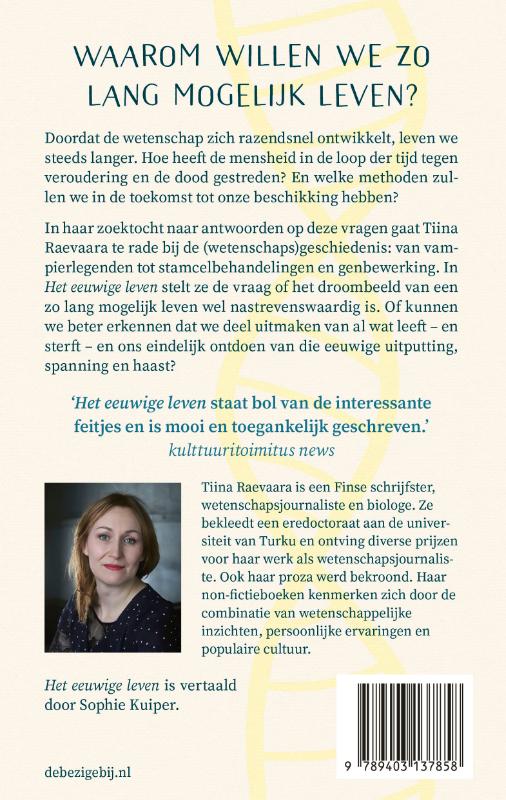 Doordat de wetenschap zich razendsnel ontwikkelt, leven we steeds langer. Hoe heeft de mensheid in de loop der tijd tegen veroudering en de dood gestreden? En welke methoden zullen we in de toekomst tot onze beschikking hebben? In haar zoektocht naar antwoorden op deze vragen gaat Tiina Raevaara te rade bij de (wetenschaps)geschiedenis: van vampierlegenden tot stamcelbehandelingen en genbewerking. In Het eeuwige leven stelt ze de vraag of het droombeeld van een zo lang mogelijk leven wel nastrevenswaardig is. Als we zouden erkennen dat we deel uitmaken van al wat leeft – en sterft – kunnen we ons dan eindelijk ontdoen van die eeuwige uitputting, spanning en haast?