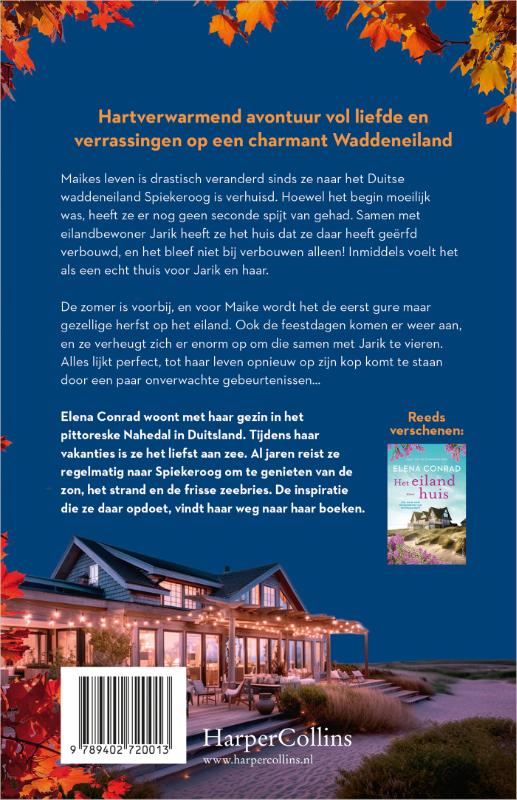 Het eilandfeest van Elena Conrad is een hartverwarmend avontuur vol liefde en verrassingen op een charmant Waddeneiland. Maikes leven is drastisch veranderd sinds ze naar het Duitse waddeneiland Spiekeroog is verhuisd. Hoewel het begin moeilijk was, heeft ze er nog geen seconde spijt van gehad. Samen met eilandbewoner Jarik heeft ze het huis dat ze daar heeft geërfd verbouwd, en het bleef niet bij verbouwen alleen! Inmiddels voelt het als een echt thuis voor Jarik en haar. De zomer is voorbij, en voor Maike wordt het de eerst gure maar gezellige herfst op het eiland. Ook de feestdagen komen er weer aan, en ze verheugt zich er enorm op om die samen met Jarik te vieren. Alles lijkt perfect, tot haar leven opnieuw op zijn kop komt te staan door een paar onverwachte gebeurtenissen… Elena Conrad woont met haar gezin in het pittoreske Nahedal in Duitsland. Tijdens haar vakanties is ze het liefst aan zee. Al jaren reist ze regelmatig naar Spiekeroog om te genieten van de zon, het strand en de frisse zeebries. De inspiratie die ze daar opdoet, vindt haar weg naar haar boeken.