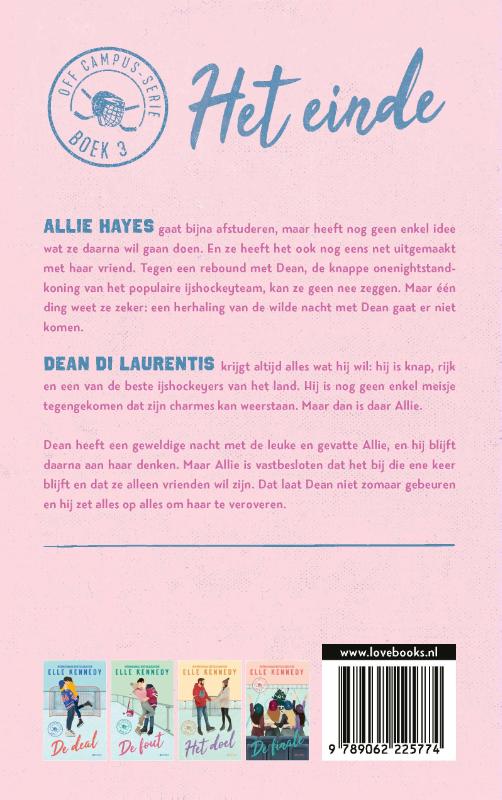Het derde deel in de grappige en steamy Off Campus-serie van Elle Kennedy. Alle delen zijn los van elkaar te lezen. Allie Hayes gaat bijna afstuderen, maar heeft nog geen enkel idee wat ze daarna wil gaan doen. En ze heeft het ook nog eens net uitgemaakt met haar vriend. Tegen een rebound met Dean, de knappe onenightstand-koning van het populaire ijshockeyteam, kan ze geen nee zeggen. Maar één ding weet ze zeker: een herhaling van de wilde nacht met Dean gaat er niet komen. Dean Di Laurentis krijgt altijd alles wat hij wil: hij is knap, rijk, en een van de beste ijshockeyers van het land. Hij is nog geen enkel meisje tegengekomen dat zijn charmes kan weerstaan. Maar dan is daar Allie. Dean heeft een geweldige nacht met de leuke en gevatte Allie, en hij blijft daarna aan haar denken. Maar Allie is vastbesloten dat het bij die ene keer blijft en dat ze alleen vrienden wil zijn. Dat laat Dean niet zomaar gebeuren en hij zet alles op alles om haar te veroveren. Het einde is het derde deel in de Off Campus-serie van Elle Kennedy, die zich afspeelt op de fictieve Briar University. Alle delen zijn los van elkaar te lezen. Het eerste deel, De deal , werd in Nederland en België al meer dan 25.000 keer gelezen en geluisterd. Ook schreef Elle Kennedy nog twee series die zich in dezelfde omgeving afspelen, getiteld Briar U en Campus Diaries.