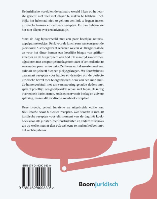 Deze tweede, geheel herziene en uitgebreide editie van Het Gerecht bevat 8 nieuwe recepten. Het Gerecht is met 40 juridische recepten voor elk moment van de dag hét kookboek voor alle juristen, rechtenstudenten en andere thuiskoks die op welke manier dan ook wel eens te maken hebben met het rechtssysteem. De juridische wereld en de culinaire wereld lijken op het eerste gezicht niet veel met elkaar te maken te hebben. Toch blijkt het helemaal niet zo gek om een link te leggen tussen juridische termen en culinaire recepten. En dan hebben we het niet alleen over een advocaatje. Start de dag bijvoorbeeld met een paar heerlijke notarisappelpannekoekjes. Denk voor de lunch eens aan een gezonde pleidooier. Als voorgerecht serveren we een WOBerginesalade en voor het diner komen een heerlijke bisque van griffierkreeftjes en de burgerplicht aan bod. De maaltijd kan worden afgesloten met een puntje ontslagroomtaart of een stuk niet te versmaden peer review cake. Zelfs een aantal arresten met een culinair tintje heeft hier een plekje gekregen. Het Gerecht bevat daarnaast recepten voor hapjes en drankjes om de perfecte juridische borrel mee te organiseren: denk aan een man­-met-de-­hamer-cocktail met als versnapering gevulde daders met spek of proeftijd, een goedgevulde schaal met tapas. De uitleg over enkele basistermen, zoals conservatoir beslag en zuivere splitsing, maken dit juridische kookboek compleet.