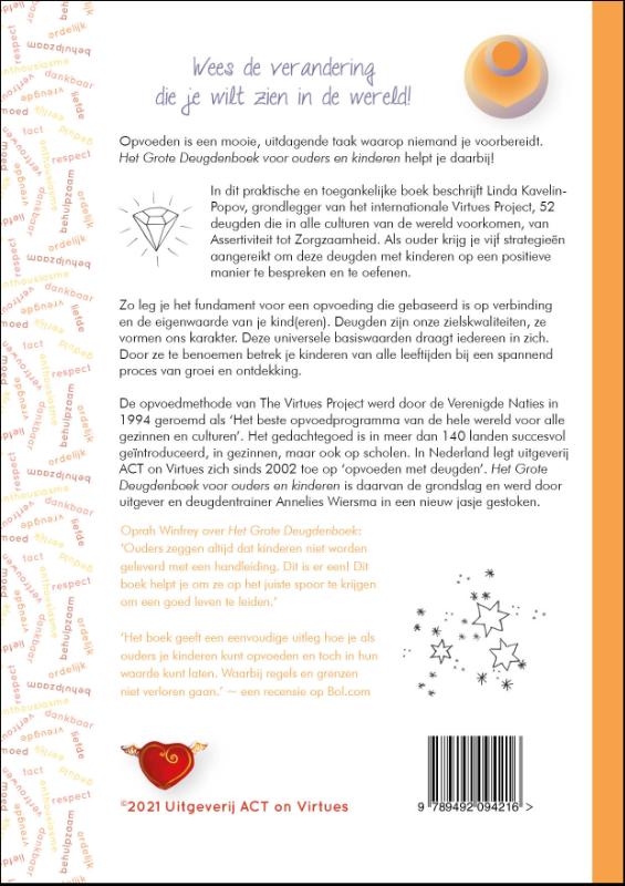 Opvoeden is een mooie, uitdagende taak waarop niemand je voorbereidt. Het Grote Deugdenboek voor ouders en kinderen helpt je daarbij! In dit praktische en toegankelijke boek beschrijft Linda Kavelin- Popov, grondlegger van het internationale Virtues Project, 52 deugden die in alle culturen van de wereld voorkomen, van Assertiviteit tot Zorgzaamheid. Als ouder krijg je vijf strategieën aangereikt om deze deugden met kinderen op een positieve manier te bespreken en te oefenen. Zo leg je het fundament voor een opvoeding die gebaseerd is op verbinding en de eigenwaarde van je kind(eren). Deugden zijn onze zielskwaliteiten, ze vormen ons karakter. Deze universele basiswaarden draagt iedereen in zich. Door ze te benoemen betrek je kinderen van alle leeftijden bij een spannend proces van groei en ontdekking. De opvoedmethode van The Virtues Project werd door de Verenigde Naties in 1994 geroemd als ‘Het beste opvoedprogramma van de hele wereld voor alle gezinnen en culturen’. Het gedachtegoed is in meer dan 140 landen succesvol geïntroduceerd, in gezinnen, maar ook op scholen. In Nederland legt uitgeverij ACT on Virtues zich sinds 2002 toe op ‘opvoeden met deugden’. Het Grote Deugdenboek voor ouders en kinderen is daarvan de grondslag en werd door uitgever en deugdentrainer Annelies Wiersma in een nieuw jasje gestoken. NB: nieuwe editie (maart 2021)