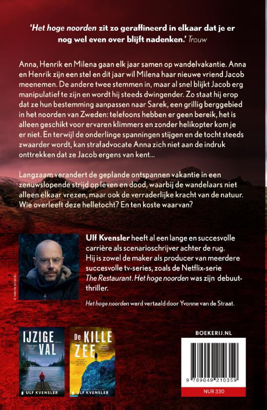 Huiveringwekkende spanning voor de fans van Jo Nesbø, Camilla Läckberg en Samuel Bjørk Anna, Henrik en Milena gaan elk jaar samen op wandelvakantie. Anna en Henrik zijn een stel en dit jaar wil Milena haar nieuwe vriend Jacob meenemen. De andere twee stemmen in, maar al snel blijkt Jacob erg manipulatief te zijn, en wordt hij steeds dwingender. Zo staat hij erop dat ze hun bestemming aanpassen naar Sarek, een grillig berggebied in het noorden van Zweden: telefoons hebben er geen bereik, het is alleen geschikt voor ervaren klimmers en zonder helikopter kom je er niet. En terwijl de onderlinge spanningen stijgen en de tocht steeds zwaarder wordt, kan strafadvocate Anna zich niet aan de indruk onttrekken dat ze Jacob ergens van kent… Langzaam verandert de geplande ontspannen vakantie in een zenuwslopende strijd op leven en dood, waarbij de wandelaars niet alleen elkaar vrezen, maar ook de verraderlijke kracht van de natuur. Wie overleeft deze helletocht? En ten koste waarvan? In de pers ‘ Het hoge noorden zit zo geraffineerd in elkaar dat je er nog wel even over blijft nadenken.’ Trouw ‘Een debuut dat smaakt naar veel meer.’ **** VN Detective & Thrillergids ‘Eén van de spannendste thrillers die ik dit jaar heb gelezen.’ De Boekenkrant ‘De spanningsboog verslapt geen moment.’ ZIN Magazine ‘ Het hoge noorden is een beklemmend debuut, waarbij ijzingwekkende momenten worden afgewisseld met een knap staaltje psychologische spanning.’ Thrillzone.nl ‘Voor mij is het duidelijk na het lezen van dit boek; Ulf Kvensler hoort bij de top van de schrijvers en schrijfsters van Scandinavische thrillers! Ik hoop dat nog vele boeken zullen volgen!’ Boekencast.nl ‘Dit is een van die boeken die de lezer vanaf de eerste pagina in zijn greep houdt.’ Upsala Nya Tidning ‘Kvensler weet hoe je de aandacht vasthoudt tot aan de allerlaatste bladzijde. Terwijl de personages wanhopig proberen in leven te blijven, is de lezer al even wanhopig op zoek naar antwoorden. Dit boek vol subtiele hints en slimme afleiders smeekt om een verfilming.’ Göteborgs-Posten ‘Een uitstekende en doodenge pageturner waarin de grillige Zweedse natuur de hoofdrol speelt. Warm aanbevolen.’ Skånska Dagbladet