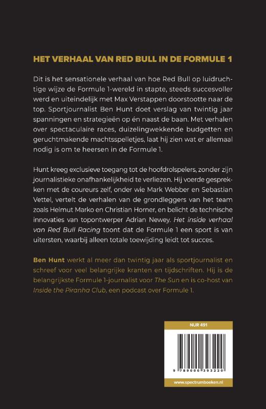 Het verhaal van Red Bull in de Formule 1 Dit is het sensationele verslag van hoe Red Bull luidruchtig de Formule 1-wereld instapte en steeds succesvoller werd om uiteindelijk de sport te domineren met Max Verstappen. Het is het verslag van twintig jaar spanningen en strategieën op en naast de baan. Het boek zit vol spectaculaire races, duizelingwekkende budgetten en machtsspelletjes en laat zien wat er allemaal nodig is om in de Formule 1 uiteindelijk te heersen. Ben Hunt had volledig toegang tot de hoofdrolspelers, maar met journalistieke onafhankelijkheid. Het is het verhaal van de grondleggers van het team als Helmut Marko en Christian Horner. Het is ook het verhaal van topontwerper Adrian Newey en zijn technische innovaties. En natuurlijk gaat het over coureurs als Coulthard, Webber en de meervoudig wereldkampioenen Sebastian Vettel en Max Verstappen. Op meeslepende wijze toont Ben Hunt dat de Formule 1 een sport is van uitersten. Alleen totale toewijding leidt tot succes. Ben Hunt werkt al twintig jaar als sportjournalist en schreef voor alle belangrijke kranten en tijdschriften. Hij is nu de belangrijkste Formule 1-journalist voor The Sun . Hij is ook mede-host van een podcast over Formule 1, Inside the Piranha Club . Het inside verhaal van Red Bull Racing is zijn tweede boek.