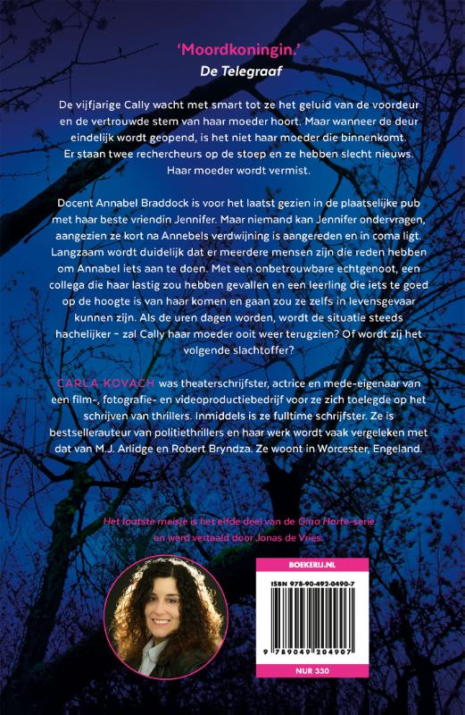 Voor de fans van M.J. Arlidge, Robert Bryndza en Lisa Regan De vijfjarige Cally wacht met smart tot ze het geluid van de voordeur en de vertrouwde stem van haar moeder hoort. Maar wanneer de deur eindelijk wordt geopend, is het niet haar moeder die binnenkomt. Er staan twee rechercheurs op de stoep en ze hebben slecht nieuws. Haar moeder wordt vermist. Docent Annabel Braddock is voor het laatst gezien in de plaatselijke pub met haar beste vriendin Jennifer. Maar niemand kan haar ondervragen, aangezien ze kort na Annabels verdwijning is aangereden en in coma ligt. Langzaam wordt duidelijk dat er meerdere mensen zijn die een reden hebben om Annabel iets aan te doen. Met een onbetrouwbare echtgenoot, een collega die haar lastig zou hebben gevallen en een leerling die iets te goed op de hoogte is van haar komen en gaan zou ze zelfs in levensgevaar kunnen zijn. Als de uren dagen worden, wordt de situatie steeds hachelijker – zal Cally haar moeder ooit weer terugzien? Of wordt zij het volgende slachtoffer? In de pers 'Gina Hart is een vrouwelijke rechercheur die haar mannetje staat.' de Telegraaf ‘Een echte pageturner.’ Leidsch Dagblad ‘Kovach zet een duistere thriller neer die zich als een film voor de ogen van de lezer afspeelt. Wij zijn fan!’ ****ThrillZone.nl ‘ Het laatste meisje is een boek vol vaart. De ontwikkelingen volgen elkaar in een hoog tempo op. Regelmatig wisselt het verhaal van perspectief, waardoor de snelheid erin blijft, net als de dreiging.' de Boekenkrant ‘Gina Harte is een stoere rechercheur die haar mannetje staat.’ De Telegraaf