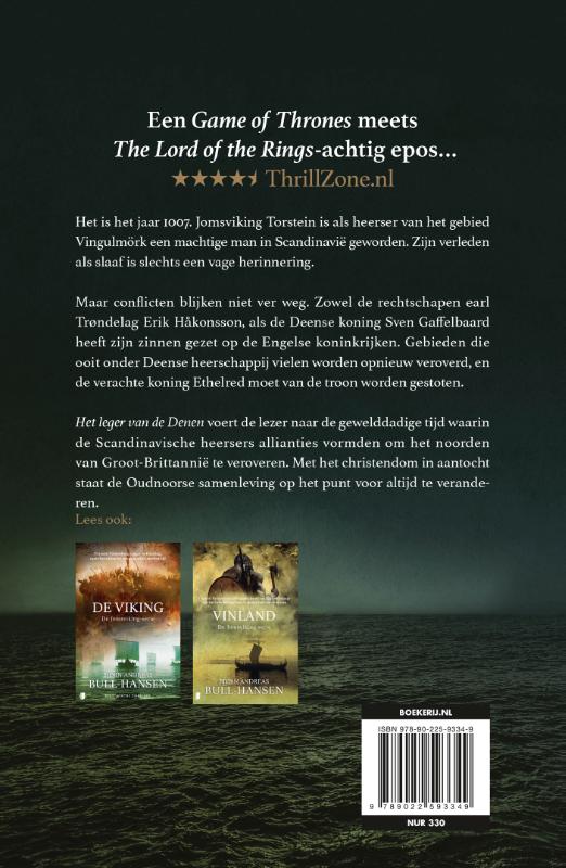 Het derde deel van De Jomsviking -serie Het is het jaar 1007. Jomsviking Torstein is als heerser van het gebied Vingulmörk een machtige man in Scandinavië geworden. Zijn verleden als slaaf is slechts een vage herinnering. Maar conflicten blijken niet ver weg. Zowel de rechtschapen earl Trøndelag Erik Håkonsson, als de Deense koning Sven Gaffelbaard heeft zijn zinnen gezet op de Engelse koninkrijken. Gebieden die ooit onder Deense heerschappij vielen worden opnieuw veroverd, en de verachte koning Ethelred moet van de troon worden gestoten. Het leger van de Denen voert de lezer naar de gewelddadige tijd waarin de Scandinavische heersers allianties vormden om het noorden van Groot-Brittannië te veroveren. Met het christendom in aantocht staat de Oudnoorse samenleving op het punt voor altijd te veranderen. De Jomsviking -serie in de pers ‘Het indrukwekkendst is Bull-Hansens stijl, van de kleinste details tot de meest indrukwekkende scènes. De personages zijn exotisch en overtuigend. Bull-Hansen kan zowel poëtisch als dramatisch zijn. Dit is bovenal een ontzettend goed verhaal!’ Dagbladet ‘Een boeiend verhaal over de groei naar volwassenheid. Absoluut een aanrader.’ NBD Biblion ‘Dit is verreweg het allerbeste boek dat ik over Vikingen heb gelezen.’ **** Hebban.nl