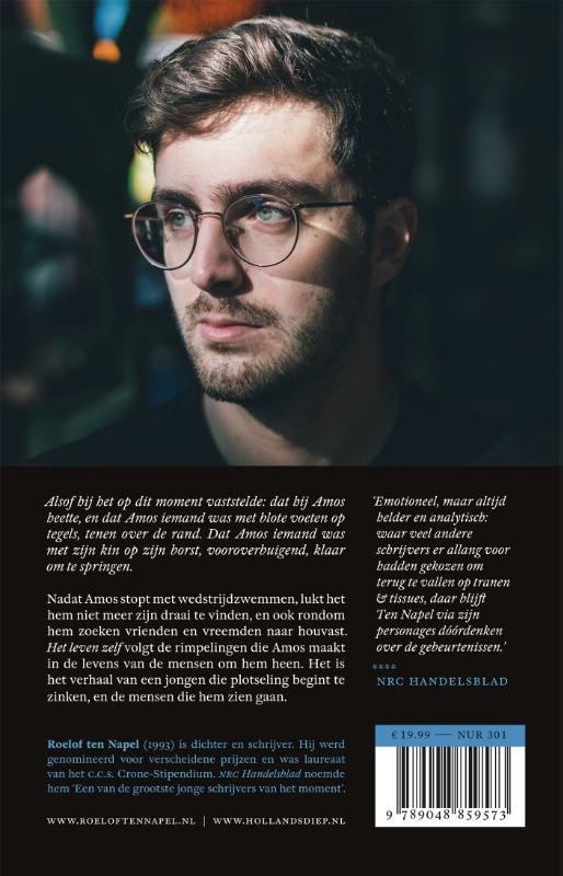 Alsof hij het op dit moment vaststelde: dat hij Amos heette, en dat Amos iemand was met blote voeten op tegels, tenen over de rand. Dat Amos iemand was met zijn kin op zijn borst, vooroverbuigend, klaar om te springen. Nadat Amos stopt met wedstrijdzwemmen, lukt het hem niet meer zijn draai te vinden, en rondom hem zoeken vrienden en vreemden evengoed naar houvast. Het leven zelf volgt de rimpelingen die Amos' keuze maakt in de levens van de mensen om hem heen. Het is het verhaal van een jongen die plotseling begon te zinken, en de mensen die hem zagen gaan.