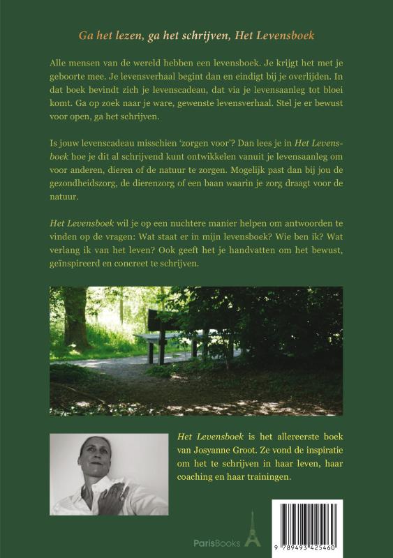 Ga het lezen, ga het schrijven, Het Levensboek Alle mensen van de wereld hebben een levensboek. Je krijgt het met je geboorte mee. Je levensverhaal begint dan en eindigt bij je overlijden. In dat boek bevindt zich je levenscadeau, dat via je levensaanleg tot bloei komt. Ga op zoek naar je ware, gewenste levensverhaal. Stel je er bewust voor open, ga het schrijven. Is jouw levenscadeau misschien ‘zorgen voor’? Dan lees je in Het Levensboek hoe je dit al schrijvend kunt ontwikkelen vanuit je levensaanleg om voor anderen, dieren of de natuur te zorgen. Mogelijk past dan bij jou de gezondheidszorg, de dierenzorg of een baan waarin je zorg draagt voor de natuur. Het Levensboek wil je op een nuchtere manier helpen om antwoorden te vinden op de vragen: Wat staat er in mijn levensboek? Wie ben ik? Wat verlang ik van het leven? Ook geeft het je handvatten om het bewust, geïnspireerd en concreet te schrijven. Het Levensboek is het allereerste boek van Josyanne Groot. Ze vond de inspiratie om het te schrijven in haar leven, haar coaching en haar trainingen.