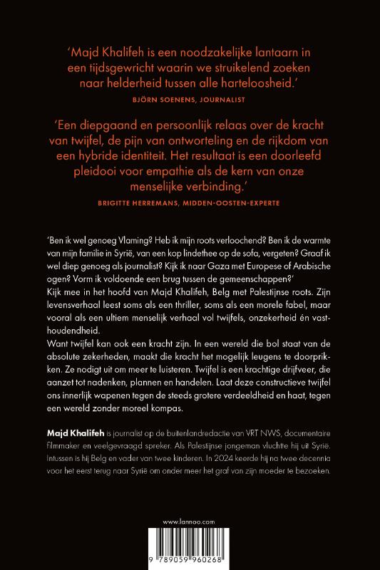 'Ben ik wel genoeg Vlaming? Heb ik mijn roots verloochend? Ben ik de warmte van mijn familie in Syrië, van een kop lindethee op de sofa, vergeten? Graaf ik wel diep genoeg als journalist? Kijk ik naar Gaza met Europese of Arabische ogen? Vorm ik voldoende een brug tussen de gemeenschappen?' Kijk mee in het hoofd van Majd Khalifeh, Belg met Palestijnse roots. Zijn levensverhaal leest soms als een thriller, soms als een morele fabel, maar vooral als een ultiem menselijk verhaal vol twijfels, onzekerheid én vasthoudendheid. Want twijfel kan ook een kracht zijn. In een wereld die bol staat van de absolute zekerheden, maakt die kracht het mogelijk leugens te doorprikken. Ze nodigt uit om meer te luisteren. Twijfel is een krachtige drijfveer, die aanzet tot nadenken, plannen en handelen. Laat deze constructieve twijfel ons innerlijk wapenen tegen de steeds grotere verdeeldheid en haat, tegen een wereld zonder moreel kompas.
