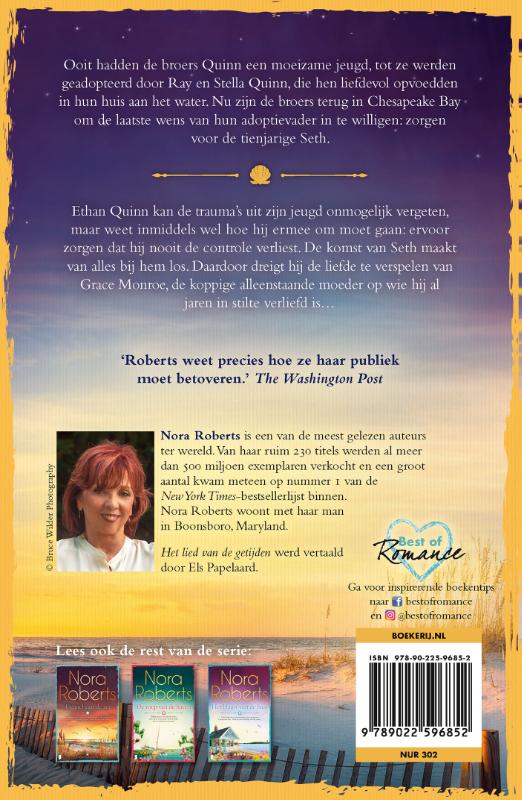 Vier broers vinden in deze heerlijke feelgoodboeken liefde aan de Atlantische Oceaan Ethan Quinn kan zijn lastige jeugd moeilijk loslaten. Maar wat als leven in het verleden hem zijn toekomst kost? Over de Chesapeake Bay -serie ‘Als je de eerste gelezen hebt wil je gelijk aan de volgende beginnen.’ ***** JoseeS, bol.com ‘Typisch Nora Roberts: je blijft maar doorlezen.’ ***** Roxyboy, bol.com ‘Zoals gewoonlijk zijn de personages van Nora Roberts geloofwaardig en aangenaam, en het herlezen van haar boeken voelt als het bezoeken van oude vrienden.’ ***** Karen Graham, Goodreads