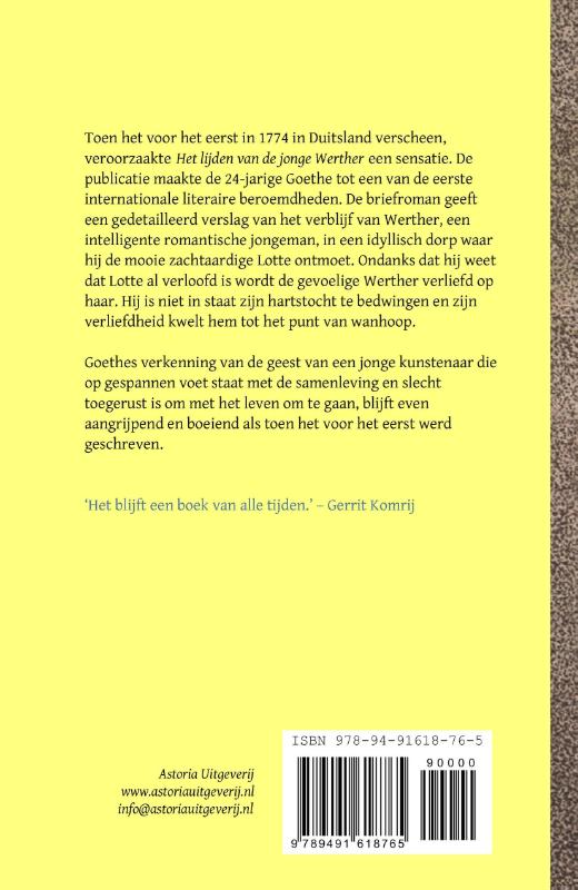 Toen het voor het eerst in 1774 in Duitsland verscheen, veroorzaakte Het lijden van de jonge Werther een sensatie. De publicatie maakte de 24-jarige Goethe tot een van de eerste internationale literaire beroemdheden. De briefroman geeft een gedetailleerd verslag van het verblijf van Werther, een intelligente romantische jongeman, in een idyllisch dorp waar hij de mooie zachtaardige Lotte ontmoet. Ondanks dat hij weet dat Lotte al verloofd is wordt de gevoelige Werther verliefd op haar. Hij is niet in staat zijn hartstocht te bedwingen en zijn verliefdheid kwelt hem tot het punt van wanhoop. Goethes verkenning van de geest van een jonge kunstenaar die op gespannen voet staat met de samenleving en slecht toegerust is om met het leven om te gaan, blijft even aangrijpend en boeiend als toen het voor het eerst werd geschreven. ‘Het blijft een boek van alle tijden.’ – Gerrit Komrij
