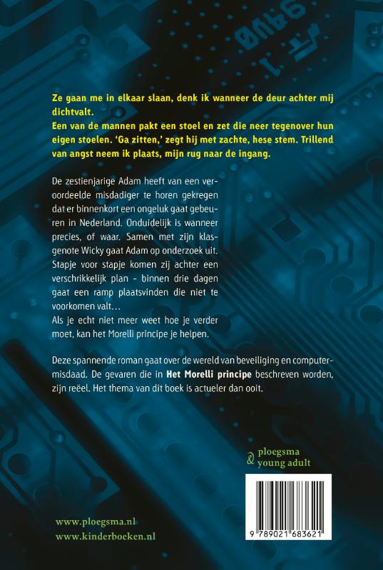 Ze gaan me in elkaar slaan, denk ik wanneer de deur achter mij dichtvalt. Een van de mannen pakt een stoel en zet die neer tegenover hun eigen stoelen. ‘Ga zitten,’ zegt hij met zachte, hese stem. Trillend van angst neem ik plaats, mijn rug naar de ingang. De zestienjarige Adam heeft van een veroordeelde misdadiger te horen gekregen dat er binnenkort een ongeluk gaat gebeuren in Nederland. Onduidelijk is wanneer precies, of waar. Samen met zijn klasgenote Wicky gaat Adam op onderzoek uit. Stapje voor stapje komen zij achter een verschrikkelijk plan – binnen drie dagen gaat een ramp plaatsvinden die niet te voorkomen valt… Als je echt niet meer weet hoe je verder moet, kan het Morelli principe je helpen. Deze spannende roman gaat over de wereld van beveiliging en computermisdaad. De gevaren die in Het Morelli principe beschreven worden zijn reëel. Het thema van dit boek is actueler dan ooit.
