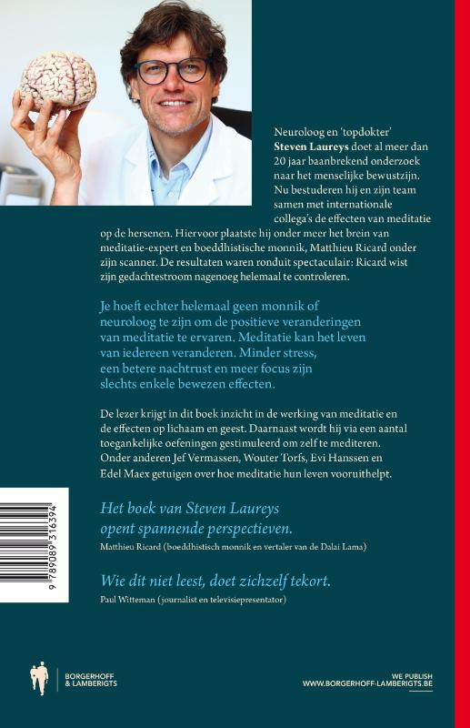Werkt meditatie of is het zweverig tijdverlies? Topneuroloog Steven Laureys voert al jaren onderzoek naar de effecten van meditatie op de hersenen. Hiervoor plaatste hij onder meer het brein van meditatie-expert Matthieu Riccard onder zijn scanner. De resultaten waren ronduit spectaculair: Riccard wist zijn gedachtestroom op commando nagenoeg helemaal stil te leggen. Tijdens eerder onderzoek toonde Riccard al het hoogste vermogen tot geluk dat ooit werd gemeten. Je moet echter helemaal geen monnik of neuroloog zijn om de positieve veranderingen van meditatie te ervaren. Meditatie kan het leven van iedereen veranderen en Laureys legt in dit boek haarfijn uit hoe. De lezer krijgt inzicht in de werking van meditatie en de effecten op lichaam en geest. Daarnaast wordt hij via een aantal toegankelijke oefeningen gestimuleerd om zelf te mediteren. Tien minuutjes per dag kunnen al een significant verschil maken. Minder stress en angst, een positieve impact op het immuunsysteem en een scherpere focus zijn slechts enkele bewezen voordelen.