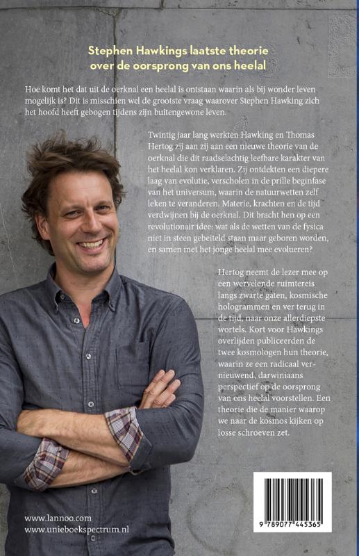 De radicale kijk van Thomas Hertog en Stephen Hawking op ons heelal – NEW SCIENTIST BOEK VAN DE MAAND 'Een diepgaand en prettig duizelingwekkend boek.' New Scientist , boek van de maand Hoe komt het dat uit de oerknal een heelal is ontstaan waarin als bij wonder leven mogelijk is? Dit is misschien wel de grootste vraag waarover Stephen Hawking zich het hoofd heeft gebogen tijdens zijn buitengewone leven. Twintig jaar lang werkten Hawking en Thomas Hertog zij aan zij aan een nieuwe theorie van de oerknal die dit raadselachtig leefbare karakter van het heelal kon verklaren. Zij ontdekten een diepere laag van evolutie, verscholen in de prille beginfase van het universum, waarin de natuurwetten zelf leken te veranderen. Materie, krachten en de tijd verdwijnen bij de oerknal. Dit bracht hen op een revolutionair idee: wat als de wetten van de fysica niet in steen gebeiteld staan maar geboren worden, en samen met het jonge heelal mee evolueren? Hertog neemt de lezer mee op een wervelende ruimtereis langs zwarte gaten, kosmische hologrammen en ver terug in de tijd, naar onze allerdiepste wortels. Kort voor Hawkings overlijden publiceerden de twee kosmologen hun theorie, waarin ze een radicaal vernieuwend, darwiniaans perspectief op de oorsprong van ons heelal voorstellen. Een theorie die de manier waarop we naar de kosmos kijken op losse schroeven zet. Dit boek gunt je een blik achter de schermen van het baanbrekende onderzoek door twee topwetenschappers, van wie de vriendschap en passie voor het vak leidden tot een geheel nieuwe visie op de kosmos. De nieuwe theorie van Hawking en Hertog verweeft de oerknal dieper dan ooit tevoren met ons menselijk bestaan en geeft zo een nieuwe kijk op onze plaats in dit onmetelijk grote heelal. 'Een prikkelend en prachtig geschreven relaas van zowel de natuurkunde als de mensen die betrokken waren bij Hawkings visionaire strijd om de kosmos te begrijpen.' dr. Neil Turok, auteur van The Universe Within 'Zijn jarenlange samenwerking met Stephen Hawking laat Hertog toe om vanuit een bevoorrecht standpunt te beschrijven hoe Hawkings fysiek gevangen geest ook in zijn latere jaren verbazingwekkende inzichten produceerde.' dr. Martin Rees, auteur van Our Cosmic Habitat 'Dit boek is niet alleen een inleiding tot Hawkings laatste theorie, maar biedt ook een blik op nog grotere theorieën in de toekomst.' dr. Sean Carroll, auteur van The Biggest Ideas in the Universe: Space, Time, and Motion