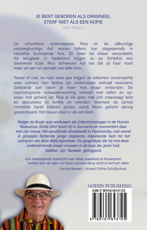 JE BENT GEBOREN ALS ORIGINEEL STERF NIET ALS EEN KOPIE John Mason De schuchtere onderwijzeres Rica en de uitbundige verpleegkundige Aaf wonen tijdens hun stageperiode in hetzelfde Surinaamse huis. Ze lijken tot elkaar veroordeeld. Na terugkeer in Nederland krijgen ze op Schiphol een daverende ruzie. Rica schreeuwt Aaf toe dat zij haar nooit meer wil zien en vertrekt met stille trom. Toeval of niet, na ruim twee jaar krijgen ze volkomen onverwachts weer contact. Hun levens zijn ondertussen radicaal veranderd. Geleidelijk aan raken ze meer met elkaar verbonden. De psychologische volwassenwording verloopt met vallen en opstaan. Het geheim dat Rica al die jaren met zich meedraagt leidt tot speculaties bij familie en vrienden. Wanneer de dames inmiddels Sarah hebben gezien, wordt Rica’s geheim alsnog geopenbaard. Het nieuws slaat in als een bom. * Rutger de Bruijn was werkzaam als (interim)manager in de Human Resources. Sinds 2007 komt hij in Suriname en overwintert daar met zijn vrouw. Het opvallende straatbeeld in Paramaribo, met overal in groepjes fietsende jonge stagiaires, inspireerde hem tot het schrijven van deze Bildungsroman. De gesprekjes die hij met deze ondernemende jonge vrouwen in de loop der jaren had, hebben zijn fantasie getriggerd. * Een meeslepende zoektocht naar liefde, waarheid en thuiskomen Verteld door de ogen van twee vrouwen die je recht in het hart raken Sandra Bernart - docent Online Schrijfschool