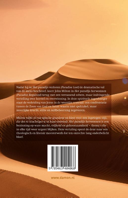 Nadat hij in 'Het paradijs verloren' ('Paradise Lost') de dramatische val van de mens beschreef, keert John Milton in 'Het paradijs herwonnen' ('Paradise Regained') terug met een verrassend sobere, maar indringende vertelling over herstel en overwinning. In deze spirituele tegenhanger staat de verleiding van Jezus in de woestijn centraal: een confrontatie tussen de Zoon van God en Satan waarin niet spektakel, maar innerlijke kracht, stilte en zelfbeheersing zegevieren. Milton wijkt af van epische grandeur en kiest voor een ingetogen stijl, die des te krachtiger is in haar eenvoud. 'Het paradijs herwonnen' is een bezinning op ware macht, vrijheid en gehoorzaamheid – thema’s die in elke tijd weer urgent blijken. Deze vertaling opent de deur naar een theologisch en literair meesterwerk dat ten onrechte lang onderbelicht bleef.