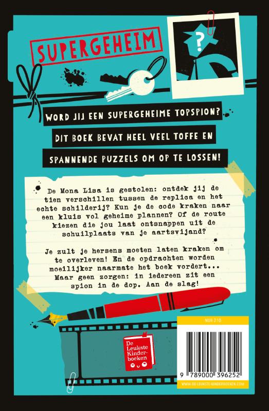 Word jij een supergeheime topspion? Dit boek bevat talloze hersenkrakende puzzels om op te lossen. De Mona Lisa is gestolen: ontdek jij de tien verschillen tussen de replica en het echte schilderij? Kun je de code kraken naar een kluis vol geheime plannen? Of de route kiezen die jou laat ontsnappen uit de schuilplaats van je aartsvijand? De puzzels dompelen jonge lezers onder in de wereld van spionage. Je zult je hersens moeten laten kraken om te overleven! De opdrachten worden moeilijker naarmate het boek vordert –lezers kunnen de puzzels, codes en mysteries oplossen en zich opwerken van beginnend spion tot meesterbrein. In iedereen zit een spion in de dop. Aan de slag! Het supergeheime spionnenpuzzelboek is perfect voor alle jonge codekrakers vanaf 9 jaar.