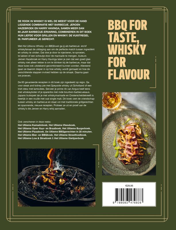 De rook in whisky is wel de meest voor de hand liggende combinatie met barbecue. Jeroen Hazebroek en Harry Havinga, samen meer dan 60 jaar barbecue-ervaring, combineren in dit boek hun liefde voor grillen en whisky. De vuistregel is: parfumeer je gerecht. Met 'Het Ultieme Whisky- en BBQboek' ga jij als barbecue- en/of whiskyfanaat de uitdaging aan om de perfecte match tussen ingrediënt en whisky te vinden. Dat doe je door te injecteren, te sproeien, te lakken of een scheutje door de marinade te mengen. Auteurs Jeroen Hazebroek en Harry Havinga laten je zien dat een goed glas whisky niet alleen lekker is om te drinken bij de barbecue, maar dat deze twee ook uitstekend gecombineerd kunnen worden. Allereerst gaan ze daarom dieper in op hoe whisky wordt gemaakt en hoe de verschillende stappen invloed hebben op de smaak. Daarna gaan we proeven. De 60 gevarieerde recepten in dit boek zijn ingedeeld op regio. Ga voor steak and kidney pie met Speyside whisky uit Schotland of een Irish stew met lamsvlees. Serveer je prime rib van Angus beef eens met whiskeyboter of je spareribs met rode bourbon-barbecuesaus. Japans buikspek lak je met whiskymarinade en Oosterscheldekreeft is heerlijk in een rouille met wat single malt. Dit boek viert de vriendschap tussen whisky en barbecue en staat vol met traditionele grillgerechten en spannende, nieuwe recepten. Probeer ze uit en proef van de whisky’s die Jeroen en Harry erbij aanraden.