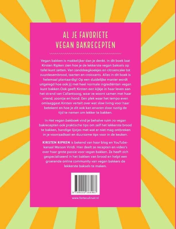 Heerlijk vegan bakboek met makkelijke recepten Vegan bakken is makkelijker dan je denkt. In dit boek laat Kirsten Ripken zien hoe je de lekkerste vegan baksels op tafel kunt zetten. Van zanddeegkoekjes en citroencake tot zuurdesembrood, taarten en croissants. Alles in dit boek is helemaal plantaardig! Op een duidelijke manier wordt uitgelegd hoe ook jij met heel normale ingrediënten vegan kunt bakken. Ook geeft Kirsten een kijkje in haar leven aan het strand van Callantsoog, waar ze woont samen met haar vriend, zoontje en hond. Een plek waar het tempo even omlaaggaat. Kirsten vertelt over wat slow living voor haar betekent en hoe je dit ook kan ervaren door rustig de tijd te nemen om lekker te bakken. In Het vegan bakboek vind je naast ruim 70 vegan bakrecepten ook praktische tips om zelf het lekkerste brood te bakken, handige lijstjes met wat er niet mag ontbreken in je voorraadkast en duurzame tips voor in de keuken.