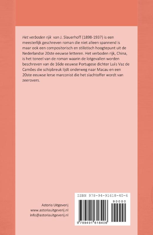 'Het verboden rijk' van J. Slauerhoff (1898-1937) is een meesterlijk geschreven roman die niet alleen spannend is maar ook een compositorisch en stilistisch hoogtepunt uit de Nederlandse 20ste eeuwse letteren. Het verboden rijk, China, is het toneel van de roman waarin de lotgevallen worden beschreven van de 16de eeuwse Portugese dichter LuÃs Vaz de Camões die schipbreuk lijdt onderweg naar Macau en een 20ste eeuwse Ierse marconist die het slachtoffer wordt van zeerovers.