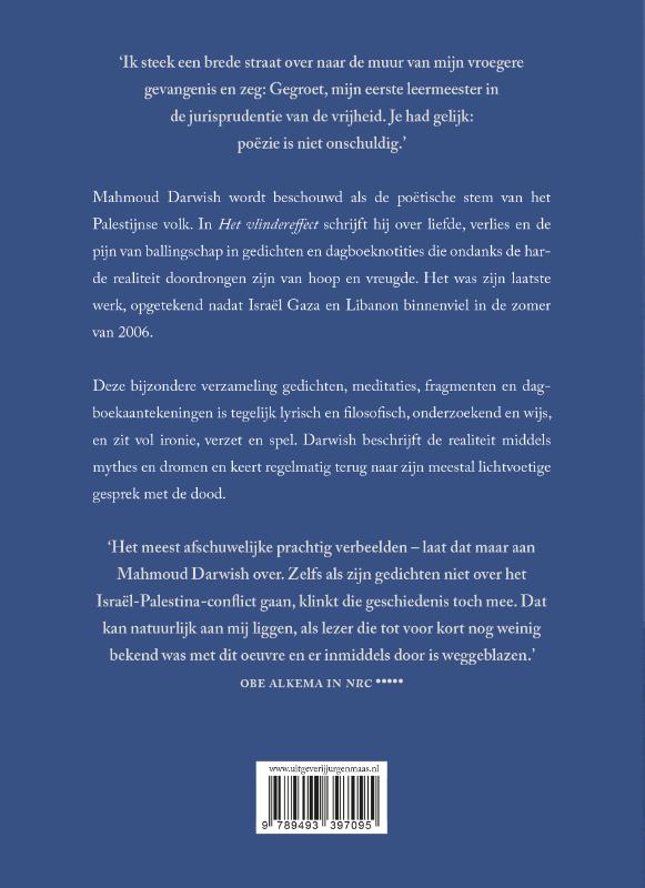 ‘Ik steek een brede straat over naar de muur van mijn vroegere gevangenis en zeg: Gegroet, mijn eerste leermeester in de jurisprudentie van de vrijheid. Je had gelijk: poëzie is niet onschuldig.’ Mahmoud Darwish wordt beschouwd als de poëtische stem van het Palestijnse volk. In ‘Het vlindereffect’ schrijft hij over liefde, verlies en de pijn van ballingschap in gedichten en dagboeknotities die ondanks de har de realiteit doordrongen zijn van hoop en vreugde. Het was zijn laatste werk, opgetekend nadat Israël Gaza en Libanon binnenviel in de zomer van 2006. Deze bijzondere verzameling gedichten, meditaties, fragmenten en dagboekaantekeningen is tegelijk lyrisch en filosofisch, onderzoekend en wijs, en zit vol ironie, verzet en spel. Darwish beschrijft de realiteit middels mythes en dromen en keert regelmatig terug naar zijn meestal lichtvoetige gesprek met de dood. Mahmoud Darwish (1941-2008) was een van de meest gevierde en bewonderde dichters in de Arabische wereld. Hij werd geboren in het dorp al-Birwa in Galilea, Palestina. Zijn familie vluchtte in 1948 naar Libanon toen het Israëlische leger hun dorp verwoestte, en keerde een jaar later in het geheim terug naar de pas opgerichte staat Israël. Darwish werkte als journalist en redacteur in Haifa tot hij in 1970 naar Moskou vertrok om te studeren. Zijn ballingschap bracht hem naar Caïro, Beiroet, Tunis, Parijs, Amman en Ramallah, waar hij zich in 1995 vestigde. Hij publiceerde ongeveer dertig bundels met poëzie en proza, die in vijfendertig talen zijn vertaald, en richtte het prestigieuze literaire tijd schrift al-Karmel op, waar hij ook hoofdredacteur van was. Darwish ontving onder andere de Grote Prins Claus Prijs. Uit het Arabisch vertaald door en met een nawoord van Richard van Leeuwen,