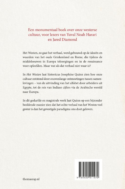 Het Westen is een baanbrekend boek dat het traditionele verhaal van de westerse beschaving volledig herziet. Quinn onderzoekt hoe de oude wereld, van de bronstijd tot de verlichting, werd gevormd door voortdurende wereldwijde ontmoetingen en uitwisselingen. In plaats van de gebruikelijke opvatting van afzonderlijke ‘beschavingen’, laat Quinn zien dat het contact tussen verschillende samenlevingen – van het ontstaan van het alfabet in Egypte tot de intrede van Indiase cijfers in Europa – de échte motor van de geschiedenis was. Een monumentaal werk dat het beeld van de westerse geschiedenis voor altijd zal veranderen.