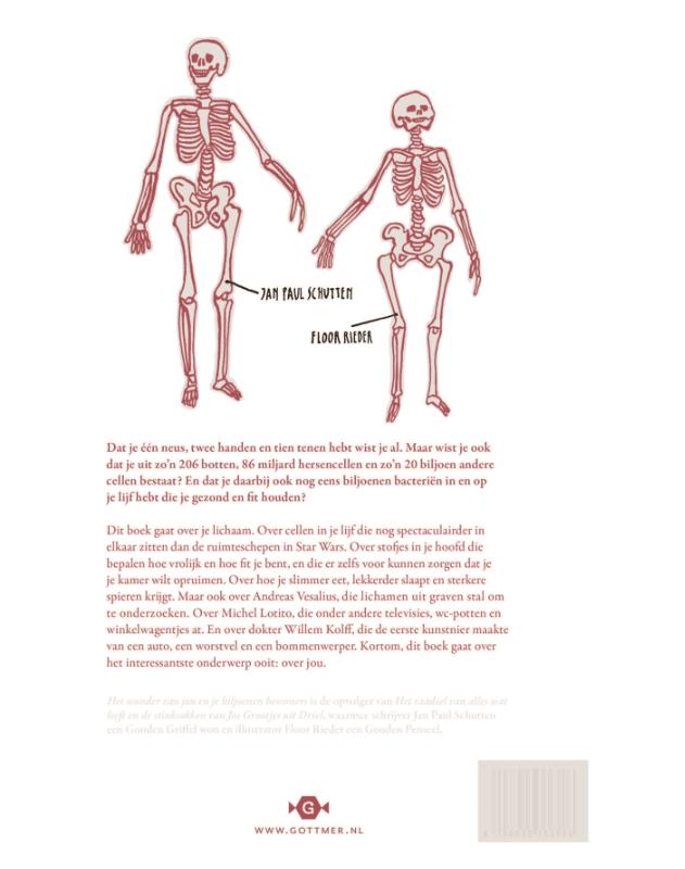 'Het wonder van jou en je biljoenen bewoners' is een schitterend geïllustreerd non-fictieboek over het menselijk lichaam, voor kinderen vanaf 9 jaar. Als er iemand een wonder is, dan ben jij het wel. Ja, jij! Neem alleen al je bloedvaten. Als je die allemaal aan elkaar vast zou plakken, dan kreeg je een draad die twee keer om de aarde past. Of denk eens aan die biljoenenmicroben die in en op je lichaam zitten en die je heel hard nodig hebt om te overleven. Hoe zien ze eruit en wat doen ze daar? 'Het wonder van jou en je biljoenen bewoners' is meer dan een boek over het menselijk lichaam. Het vertelt hoe een cel er vanbinnen uitziet. En dat een gewone cel in jouw lichaam er nog spectaculairder uitziet dan de Death Star uit 'Star Wars'. Het legt uit hoe je kunt zien of iemand verliefd op je is, waarom je sneller boos wordt bij warm weer en waarom je slim wordt van kauwgom eten. Dat dus - en nog veel, veel, véél meer... 'Het wonder van jou en je biljoenen bewoners' is het tweede deel van de grensverleggende non-fictietrilogie van Jan Paul Schutten en Floor Rieder. Het eerste deel, 'Het raadsel van alles wat leeft', over de evolutie, werd bekroond met de Gouden Griffel én het Gouden Penseel, en het derde deel in de reeks, 'Het mysterie van niks en oneindig veel snot', gaat over het ontstaan van het heelal. Alle drie de boeken zijn luxe uitgevoerd met goud-op-snee-bladzijden en een linnen rug.