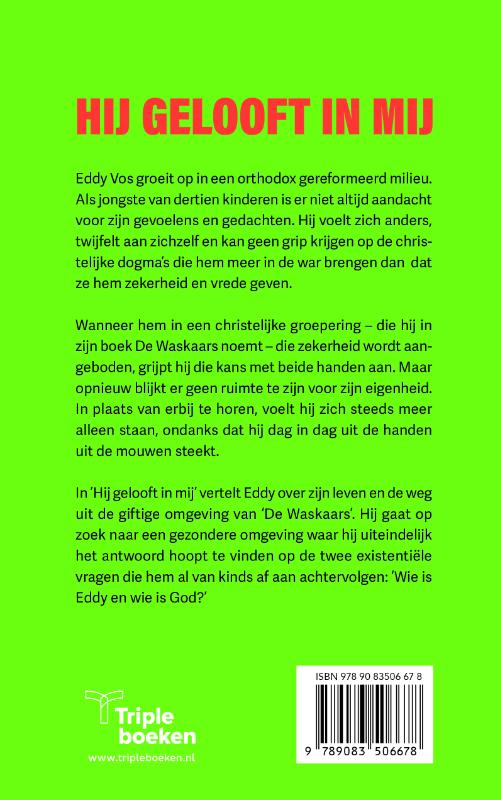 Eddy Vos groeit op in een orthodox gereformeerd milieu. Als jongste van dertien kinderen is er niet altijd aandacht voor zijn gevoelens en gedachten. Hij voelt zich anders, twijfelt aan zichzelf en kan geen grip krijgen op de christelijke dogma’s die hem meer in de war brengen dan dat ze hem zekerheid en vrede geven. Wanneer hem in een christelijke groepering – die hij in zijn boek De Waskaars noemt – die zekerheid wordt aangeboden, grijpt hij die kans met beide handen aan. Maar opnieuw blijkt er geen ruimte te zijn voor zijn eigenheid. In plaats van erbij te horen, voelt hij zich steeds meer alleen staan, ondanks dat hij dag in dag uit de handen uit de mouwen steekt. In ’Hij gelooft in mij’ vertelt Eddy over zijn leven en de weg uit de giftige omgeving van ‘De Waskaars’. Hij gaat op zoek naar een gezondere omgeving waar hij uiteindelijk het antwoord hoopt te vinden op de twee existentiële vragen die hem al van kinds af aan achtervolgen: ‘Wie is Eddy en wie is God?’ 'Waar was ik in terechtgekomen? Dit hele systeem klopte voor geen meter. Ik wilde het liefst wegvluchten. Weg van ‘De Waskaars’. Weg van de mensen die in woorden wel zeiden vriend en familie te zijn, maar waar ik, als het erop aankwam, niets van merkte. Ik voelde me zo alleen! Onbegrepen en niemand om mee te praten. Niemand die echt te vertrouwen was. Zelfs tegen mijn vrouw durfde ik niets te zeggen, omdat ik dacht dat zij dit dan aan de voorganger zou doorgeven. Zo werkte het systeem. Als ik twijfel zou uitspreken, was dat een zonde. Dus hield ik mijn mond en ging verder op de automatische piloot.' Eddy Vos (1971) is getrouwd met Wilma. Samen met hun twee katten wonen ze op een steenworp van de Duitse grens in de Achterhoek. Na jarenlang in de financiële sector gewerkt te hebben, maakt hij in 2016 de switch naar de zorg, waar hij als applicatiebeheerder werkzaam is voor een organisatie die ambulante zorg biedt aan kinderen, jongeren en gezinnen die te maken hebben met autisme.
