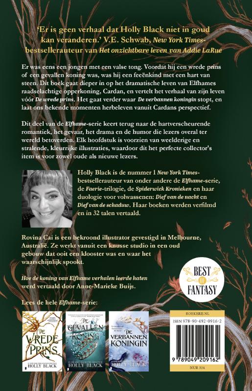 Prachtige limited edition met full color binnenwerkillustraties, unieke kleurvariant van het omslag, boekblokbedrukking en bandstempel Een verhaal in de wereld van Elfhame, dat zich afspeelt na deel 3 De verbannen koningin Er was eens een jongen met een valse tong. Voordat hij een wrede prins of een valse koning was, was hij een feeënkind met een hart van steen. Zijn verhaal gaat dieper in op het dramatische leven van Elfhames raadselachtige opperkoning, Cardan, en bevat heerlijke details over zijn leven vóór De wrede prins . Dit avontuur gaat verder dan De verbannen koningin , en vertelt bekende momenten vanuit Cardans perspectief. Dit deel van de Elfhame -serie keert terug naar de hartverscheurende romantiek, het gevaar, de humor en het drama die lezers overal ter wereld betoverden. Elk hoofdstuk is voorzien van weelderige en stralende, kleurrijke tekeningen, waardoor dit de perfecte toevoeging is aan de verzameling van zowel nieuwe als oude lezers. De pers over Holly Black ‘Een fantastische reis naar een huiveringwekkend elfenland, prachtig bloemrijk geschreven vol grillige personages.’ **** Algemeen Dagblad ‘Verleidelijk, gevaarlijk en volkomen verslavend.’ Leigh Bardugo ‘Een betoverende aanvulling op de geliefde Elfhame-serie. (..) Een vermakelijk en sfeervol verhaal.’ de Boekenkrant ‘Bewonderenswaardig, vol spanning, romantiek en mythologie. Dit is YA-fantasy van de bovenste plank.’ NBD Biblion