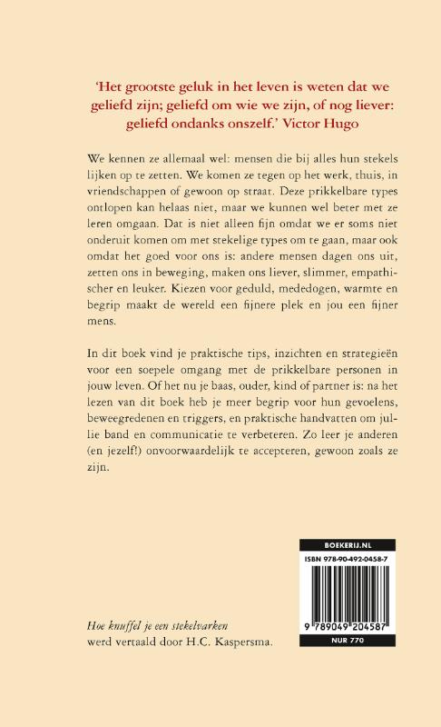 Hoe ga je om met moeilijke mensen? In dit boek vind je praktische tips, inzichten en strategieën om de prikkelbare types in jouw leven (inclusief jezelf!) onvoorwaardelijk te accepteren, gewoon zoals ze zijn. ‘Ik denk bij voorkeur altijd het beste over iedereen. Dat scheelt zo veel gedoe.’ Rudyard Kipling We kennen er allemaal wel een: mensen die bij alles hun stekels lijken op te zetten. We komen ze tegen op het werk, thuis, in vriendschappen of gewoon op straat. Deze prikkelbare types ontlopen kan helaas niet, maar we kunnen wel beter met ze leren omgaan. Dat is niet alleen fijn omdat we er soms niet onderuit komen om met stekelige types om te gaan, maar ook omdat het goed voor ons is: andere mensen dagen ons uit, zetten ons in beweging, maken ons liever, slimmer, empathischer en leuker. Kiezen voor geduld, mededogen, warmte en begrip maakt de wereld een fijnere plek en jou een fijner mens. In dit boek vind je praktische tips, inzichten en strategieën voor een soepele omgang met de prikkelbare personen in jouw leven. Of het nu je baas, ouder, kind of partner is: na het lezen van dit boek heb je meer begrip voor hun gevoelens, beweegredenen en triggers, en praktische handvatten om jullie band en communicatie te verbeteren. Zo leer je anderen (en jezelf!) onvoorwaardelijk te accepteren, gewoon zoals ze zijn. ‘Het grootste geluk in het leven is weten dat we geliefd zijn; geliefd om wie we zijn, of nog liever: geliefd ondanks onszelf.’ Victor Hugo