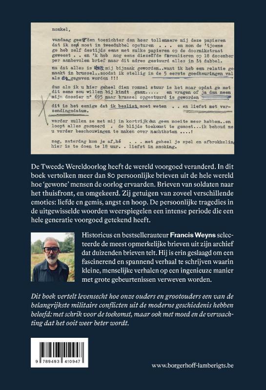 De Tweede Wereldoorlog heeft de wereld voorgoed veranderd en een hele generatie ingrijpend getekend. Dit boek schetst aan de hand van meer dan 70 persoonlijke brieven hoe de oorlog dag op dag werkelijk werd ervaren. Brussel, Berlijn, Londen, Iwo Jima of Stalingrad: in dit boek geeft elke brief op een indringende manier weer hoe mensen met persoonlijke tragedies werden geconfronteerd en op welke manier ze met die gebeurtenissen omgingen. Liefde of scheiding, leven of dood, angst of hoop... werkelijk elke menselijke emotie werd tijdens de oorlogsjaren door iedereen intens beleefd. Auteur Francis Weyns putte voor het schrijven van dit boek uit zijn uitgebreide brievenarchief en selecteerde uit de duizenden brieven die hij in de loop van de jaren verzamelde 73 brieven waarmee de auteur er als geen ander in slaagt om het persoonlijk en menselijke aspect van de Tweede Wereldoorlog bloot te leggen.