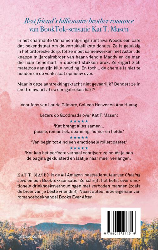 In het charmante Cinnamon Springs runt Eva Woods een café dat bekendstaat om de verrukkelijkste donuts. Ze is gelukkig en gesetteld in het pittoreske dorpsleven. Tot ze moet samenwerken met Aston, de knappe miljardairsbroer van haar vriendin Maddy – en de man die haar tienerhart in duizend stukken brak. Ze ergert zich mateloos aan zijn kille rigide houding. En toch… de chemie is niet te houden en de vonken slaan alweer over. Maar is deze aantrekkingskracht niet gevaarlijk? Met de grote dag en Aston’s terugkeer naar New York in zicht, vraagt Eva zich af: is dit haar tweede kans of dendert ze in sneltreinvaart opnieuw naar een gebroken hart? Voor lezers van Colleen Hoover, Laurie Gilmore en Ana Huang.