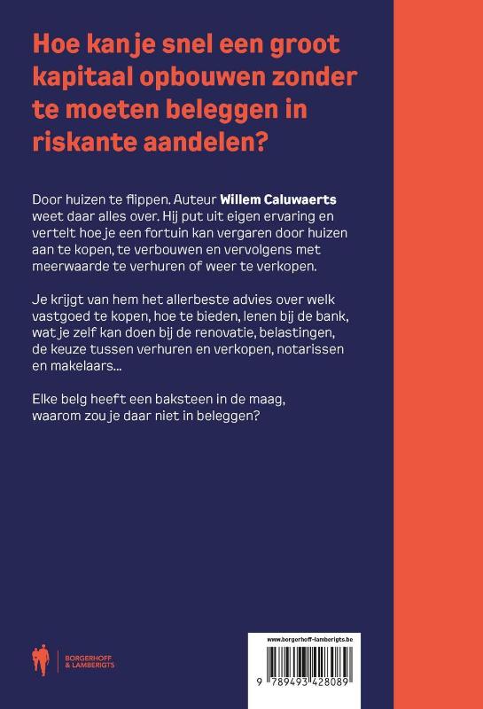 Hoe kan je snel een groot kapitaal opbouwen zonder te moeten beleggen in riskante aandelen? Door huizen te flippen. Auteur Willem Caluwaerts weet daar alles over. Hij put uit eigen ervaring en vertelt hoe je een fortuin kan vergaren door huizen aan te kopen, te verbouwen en vervolgens met meerwaarde te verhuren of weer te verkopen. Je krijgt van hem het allerbeste advies over welk vastgoed te kopen, hoe te bieden, lenen bij de bank, wat je zelf kan doen in de verbouwing, belastingen, de keuze tussen verhuren en verkopen, notarissen en makelaars... Een betere belegging dan dit bestaat er niet...