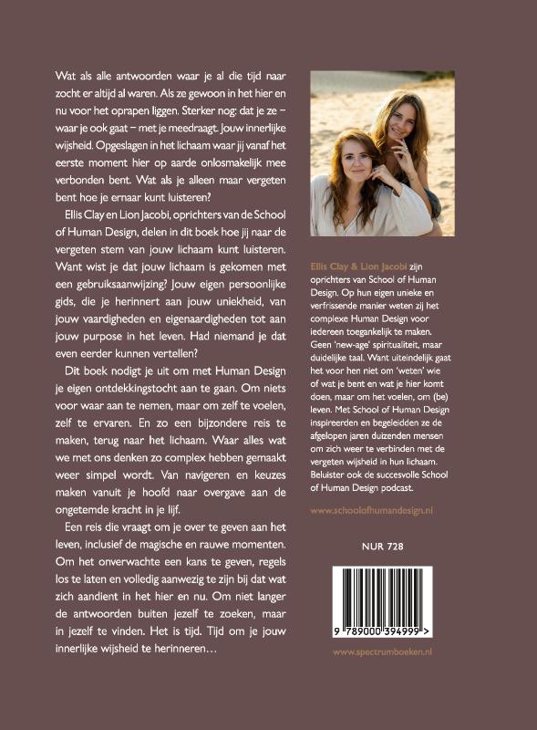 Het is tijd om je jouw innerlijke wijsheid te herinneren Wat als alle antwoorden waar je al die tijd naar zocht er altijd al waren. Als ze gewoon in het hier en nu voor het oprapen liggen. Sterker nog: dat je ze – waar je ook heen gaat – met je meedraagt. Jouw innerlijke wijsheid. Opgeslagen in het lichaam waar jij vanaf het eerste moment hier op aarde onlosmakelijk mee verbonden bent. Wat als je alleen maar vergeten bent hoe je ernaar kunt luisteren? Ellis Clay en Lion Jacobi, oprichters van de School of Human Design, delen in dit boek hoe jij naar de vergeten stem van jouw lichaam kunt luisteren. Want wist je dat jouw lichaam is gekomen met een gebruiksaanwijzing? Jouw eigen persoonlijke gids, die je herinnert aan jouw uniekheid, van jouw vaardigheden en eigenaardigheden tot aan jouw purpose in het leven. Had niemand je dat even eerder kunnen vertellen? Dit boek nodigt je uit om met Human Design je eigen ontdekkingstocht aan te gaan. Om niets voor waar aan te nemen, maar om zelf te voelen, zelf te ervaren. En zo een bijzondere reis te maken, terug naar het lichaam. Waar alles wat we met ons denken zo complex hebben gemaakt weer simpel wordt. Van navigeren en keuzes maken vanuit je hoofd naar overgave aan de ongetemde kracht in je lijf. Een reis die vraagt om je over te geven aan het leven, inclusief de magische en rauwe momenten. Om het onverwachte een kans te geven, regels los te laten en volledig aanwezig te zijn bij dat wat zich aandient in het hier en nu. Om niet langer de antwoorden buiten jezelf te zoeken, maar in jezelf te vinden. Het is tijd. Tijd om je jouw innerlijke wijsheid te herinneren… Het Human Design handboek van deze tijd dat inzicht geeft in waar we collectief nu doorheen gaan en wat jouw rol is in het geheel Een meeslepend verhaal van licht (en een ideale wereld) naar donker (de huidige not-self wereld) naar transformatie (de weg van Human Design) Leer op een organische manier met je eigen chart bij de hand de belangrijkste Human Design onderdelen (en meer) kennen Inclusief omschrijvingen van de 64 poorten en 36 kanalen Onderdelen en thema’s die aan bod komen zijn onder andere: de bodychart, definitie, type, strategie, autoriteit, centers, profiel, not-self en signature thema, poorten en kanalen, circuits, incarnatie kruis, nodes, chiron, motivatie, voeding, omgeving en pijlen, connectie thema en relatiekanalen, angsten, conditioneringen en deconditioneren, evolutionaire verschuivingen en de transitie van 2027 Ellis Clay & Lion Jacobi zijn oprichters van School of Human Design. Op hun eigen unieke en verfrissende manier weten zij het complexe Human Design voor iedereen toegankelijk te maken. Geen ‘new-age’ spiritualiteit, maar duidelijke taal. Want uiteindelijk gaat het voor hen niet om ‘weten’ wie of wat je bent en wat je hier komt doen, maar om het voelen, om (be)leven. Met School of Human Design inspireerden en begeleidden ze de afgelopen jaren duizenden mensen om zich weer te verbinden met de vergeten wijsheid in hun lichaam. Beluister ook de succesvolle School of Human Design podcast.