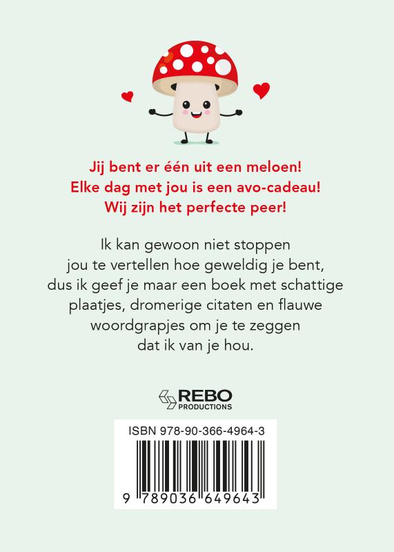 Jij bent er één uit een meloen! Elke dag met jou is een avo-cadeau! Wij zijn het perfecte peer! Ik kan gewoon niet stoppen jou te vertellen hoe geweldig je bent, dus ik geef je maar een boek met schattige plaatjes, dromerige citaten en flauwe woordgrapjes om je te zeggen dat ik van je hou.