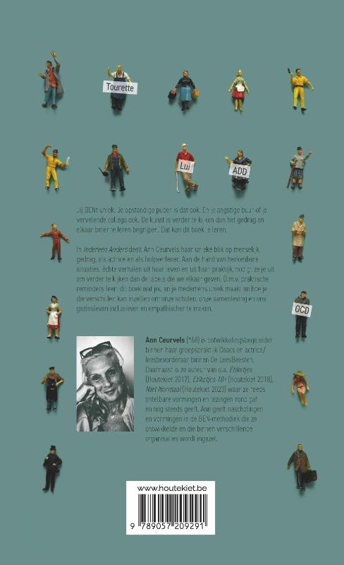 Ontdek wie je echt BENt. Jij BENt uniek. De persoon naast je is dat ook. En die lastigecollega of dat vervelende kind ook. Iedereen heeft een eigen verhaal, en pas wanneer je dat kent kan je begrip opbrengen voor elkaar. BEN, een simpele methodiek, helpt je het verhaal áchter de mens te zien. In Iedereen Anders deelt Ann Ceurvels haar unieke kijk op diversiteit, als hulpverlener en als actrice en verhalenverteller. Aan de hand van herkenbare situaties, persoonlijke inzichten en verhalen uit de praktijk nodigt ze je uit om verder te kijken dan het label, de ‘etiketjes’ en het gedrag van je kind, partner of collega. Met praktische handvaten en reflectievragen leert dit boek je niet wat mensen anders maakt, maar hoe je kunt leren zien wat hen én jou uniek maakt en hoe die verschillen onze scholen, samenleving en huishoudens kunnen verrijken.