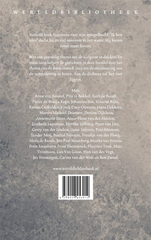 Villanellen over het thema van de Boekenweek 2023 Verliefd keek Narcissus naar zijn spiegelbeeld. 'Ik ben alles' dacht hij en viel voorover in het water. Hij kwam niet meer boven. Na het sonnet in 2020, het epigram in 2021, het rondeel in 2022 is het nu de beurt aan de villanelle. Een passende dichtvorm voor het thema van de Boekenweek.